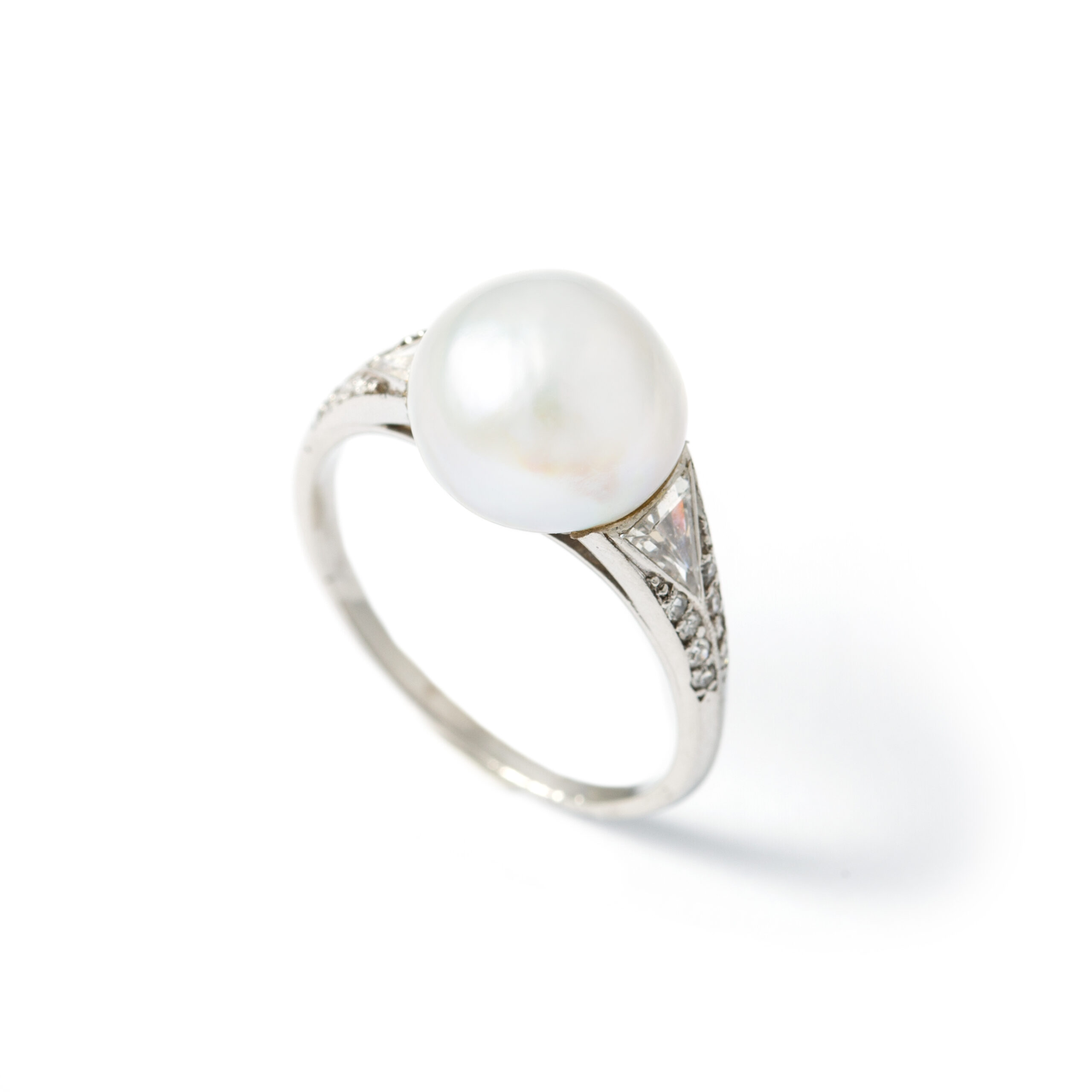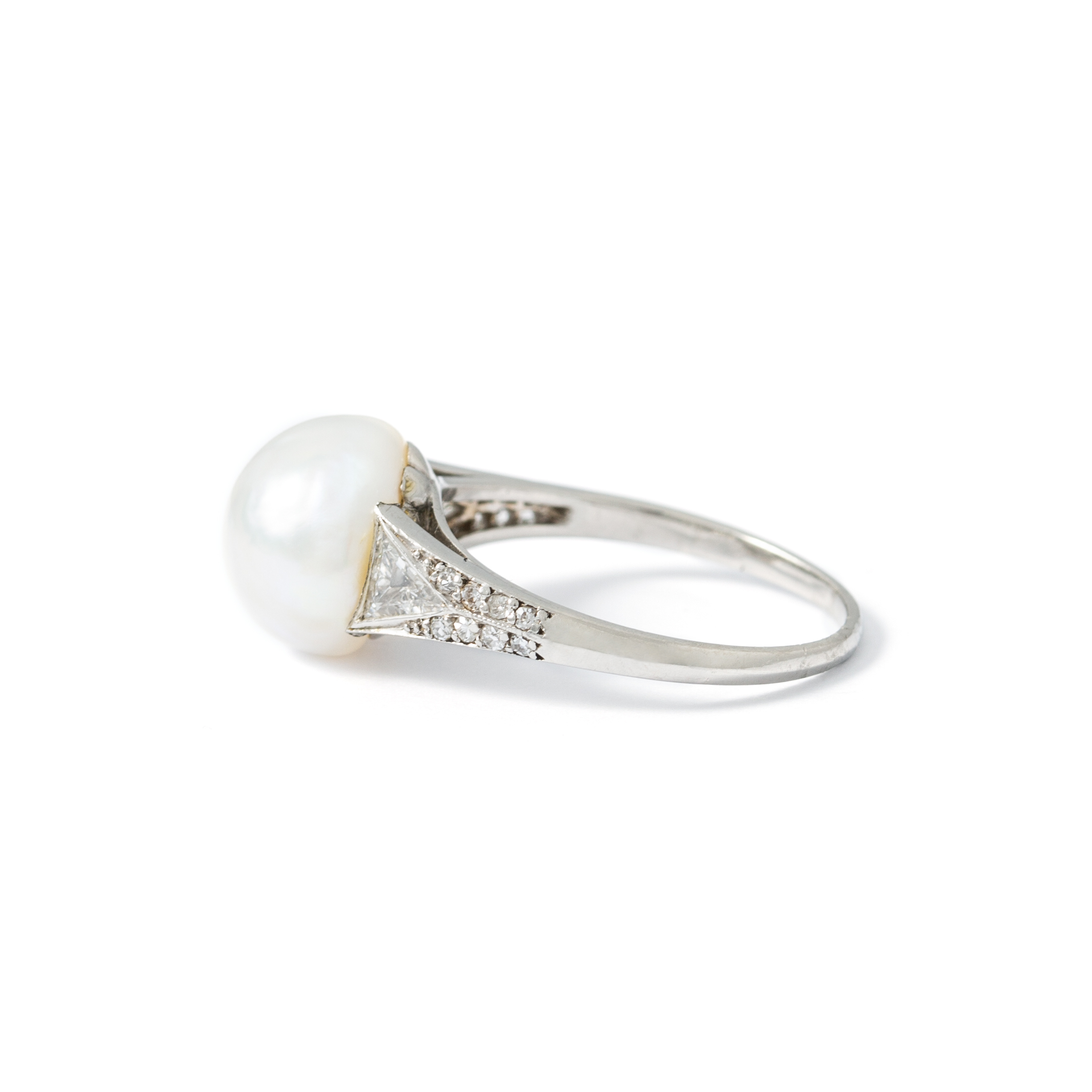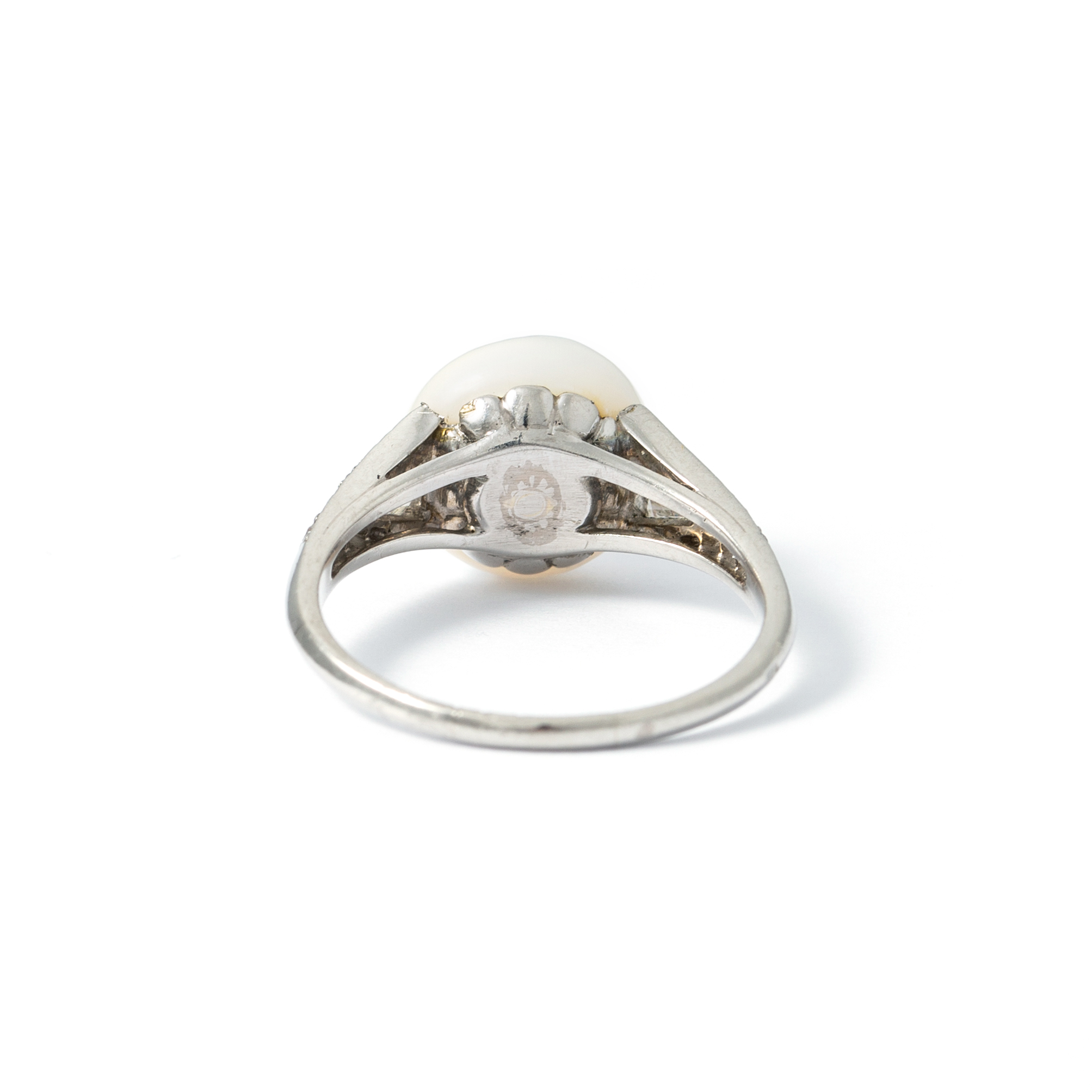 Ring in white gold 18kt set with one button real pearl and diamonds