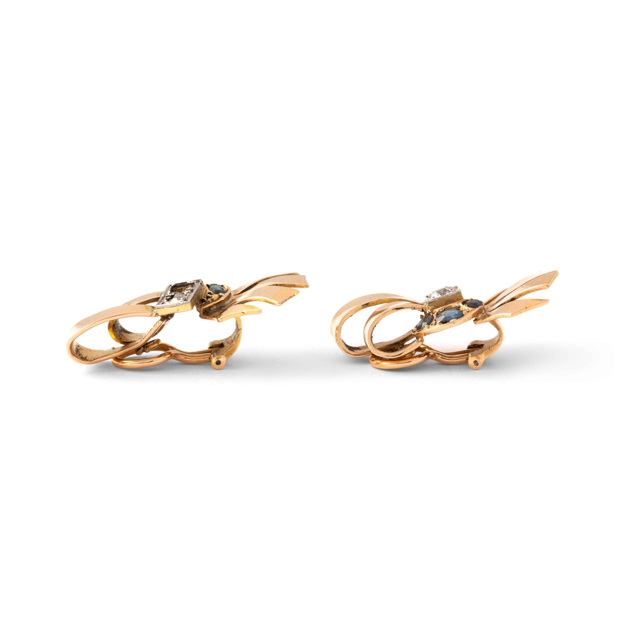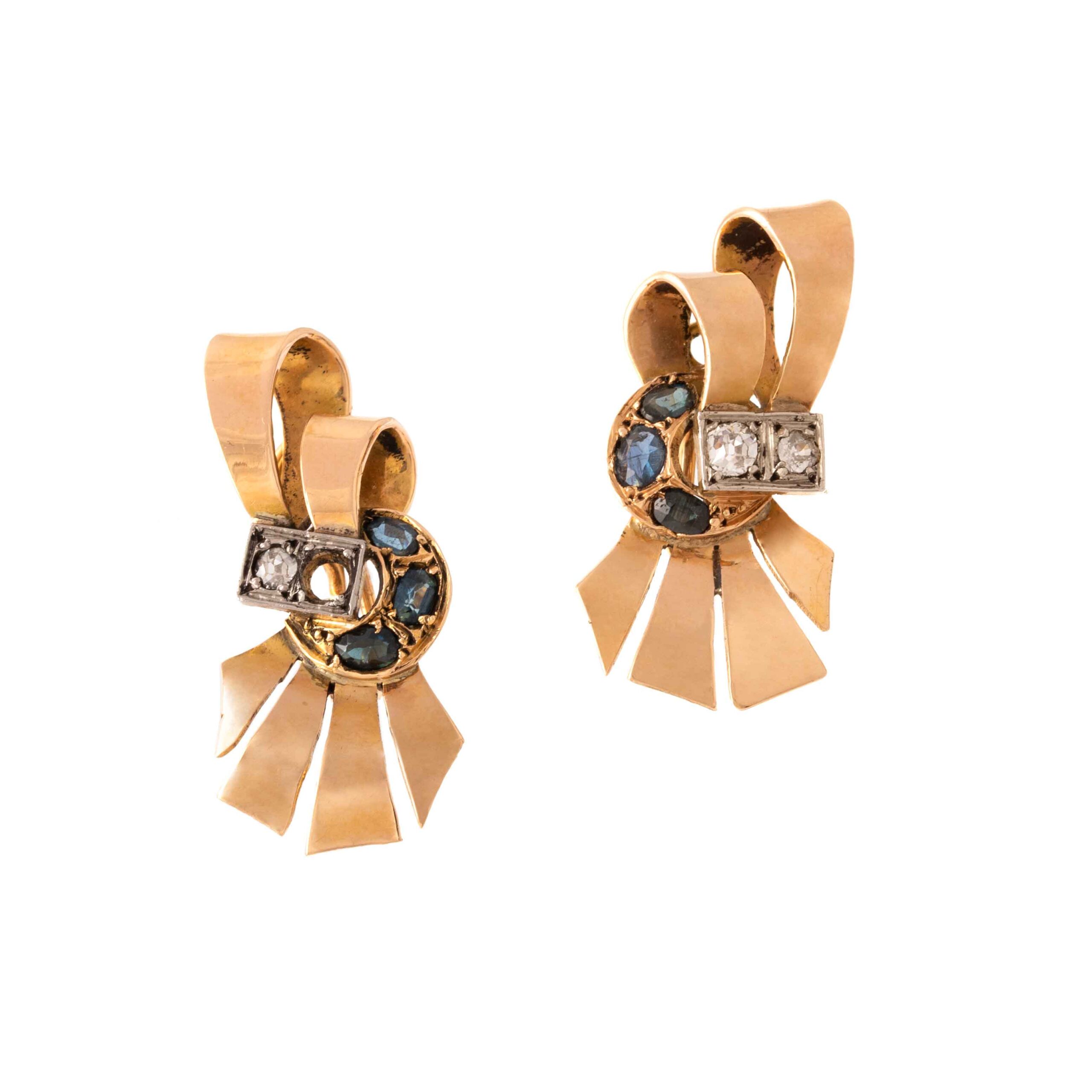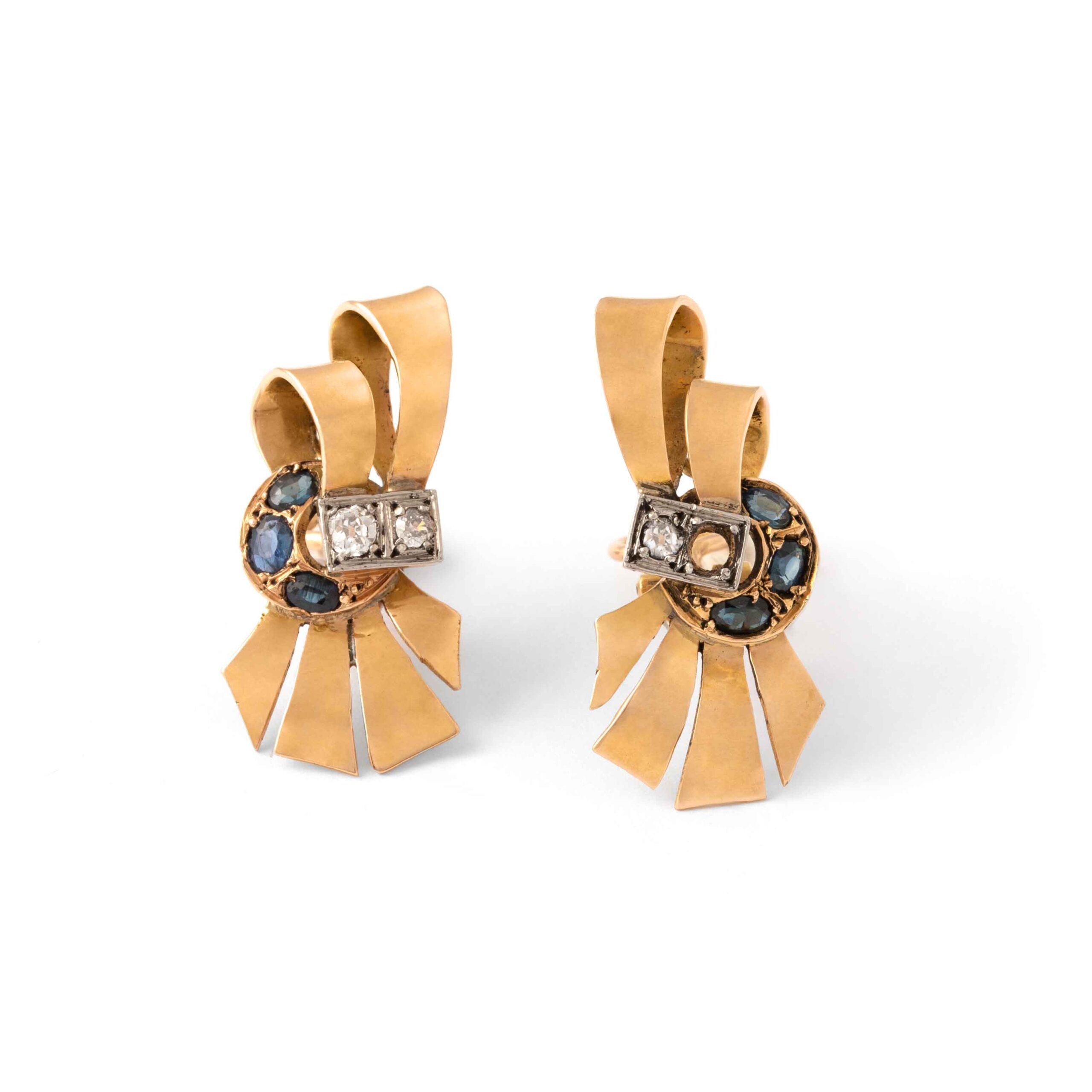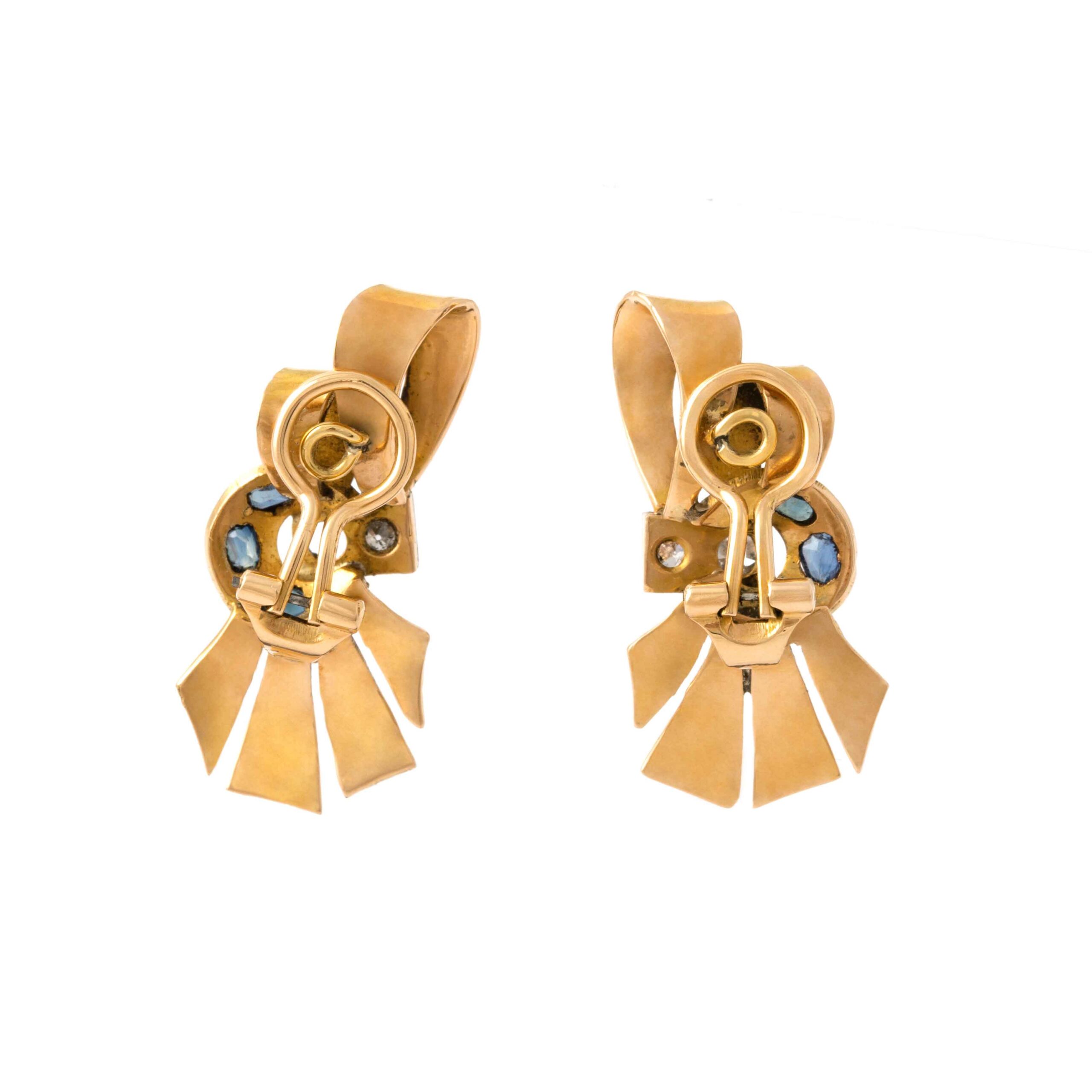 Adorn yourself with the timeless elegance of these Retro Diamond and Sapphire Earrings from circa 1950. Crafted in 18K gold, these exquisite earrings feature sparkling diamonds and vibrant sapphires, reflecting the classic sophistication of a bygone era. Perfect for adding a touch of vintage glamour to any outfit.