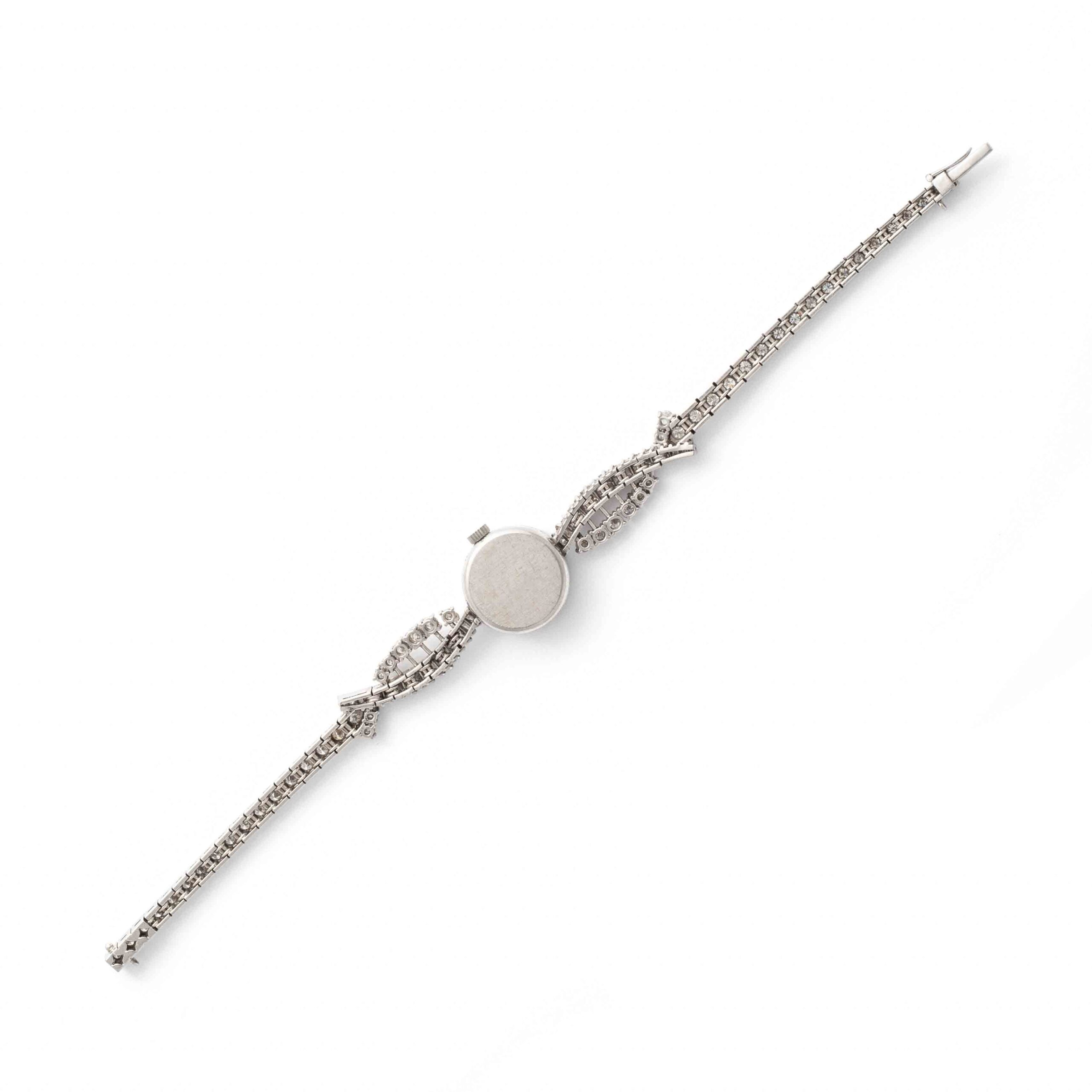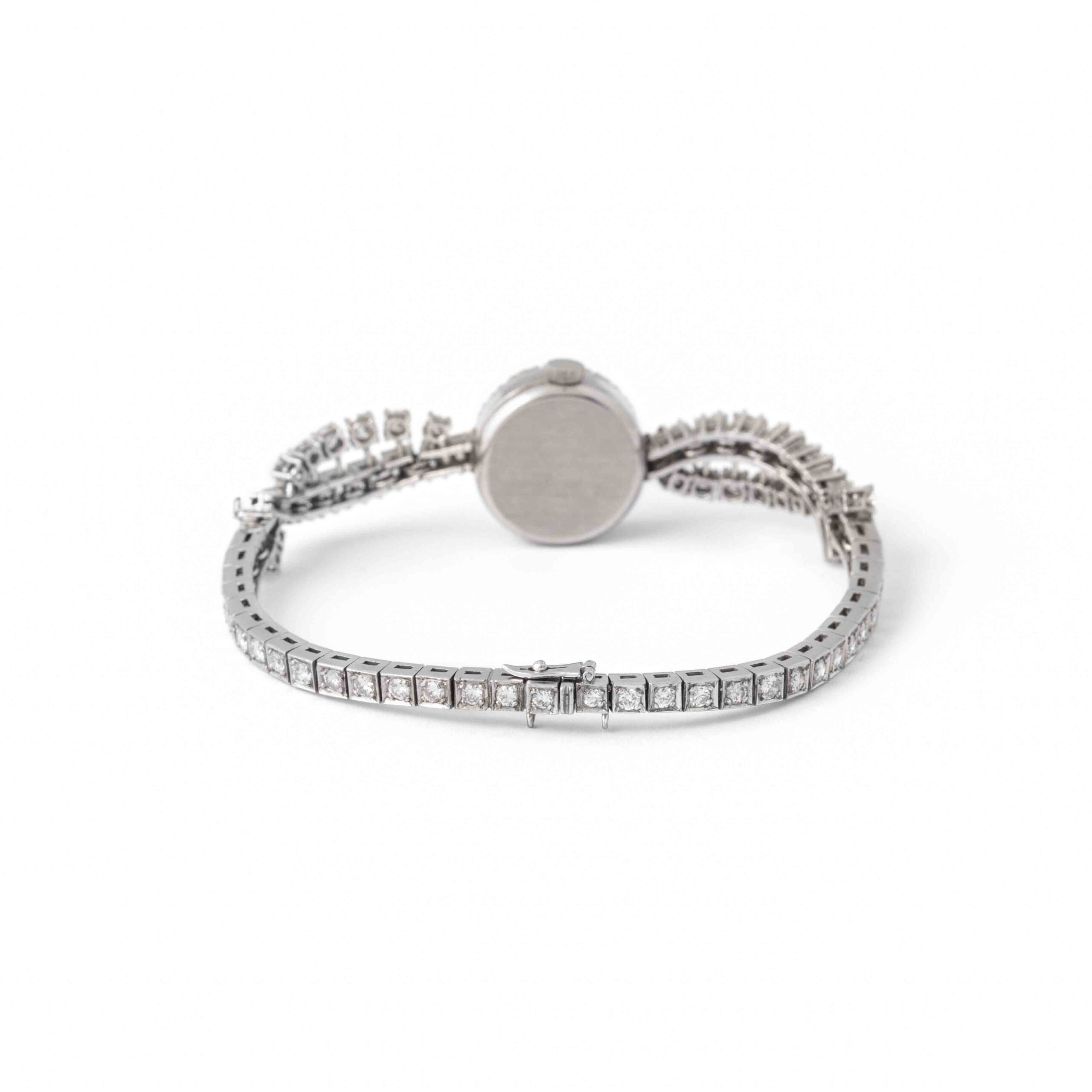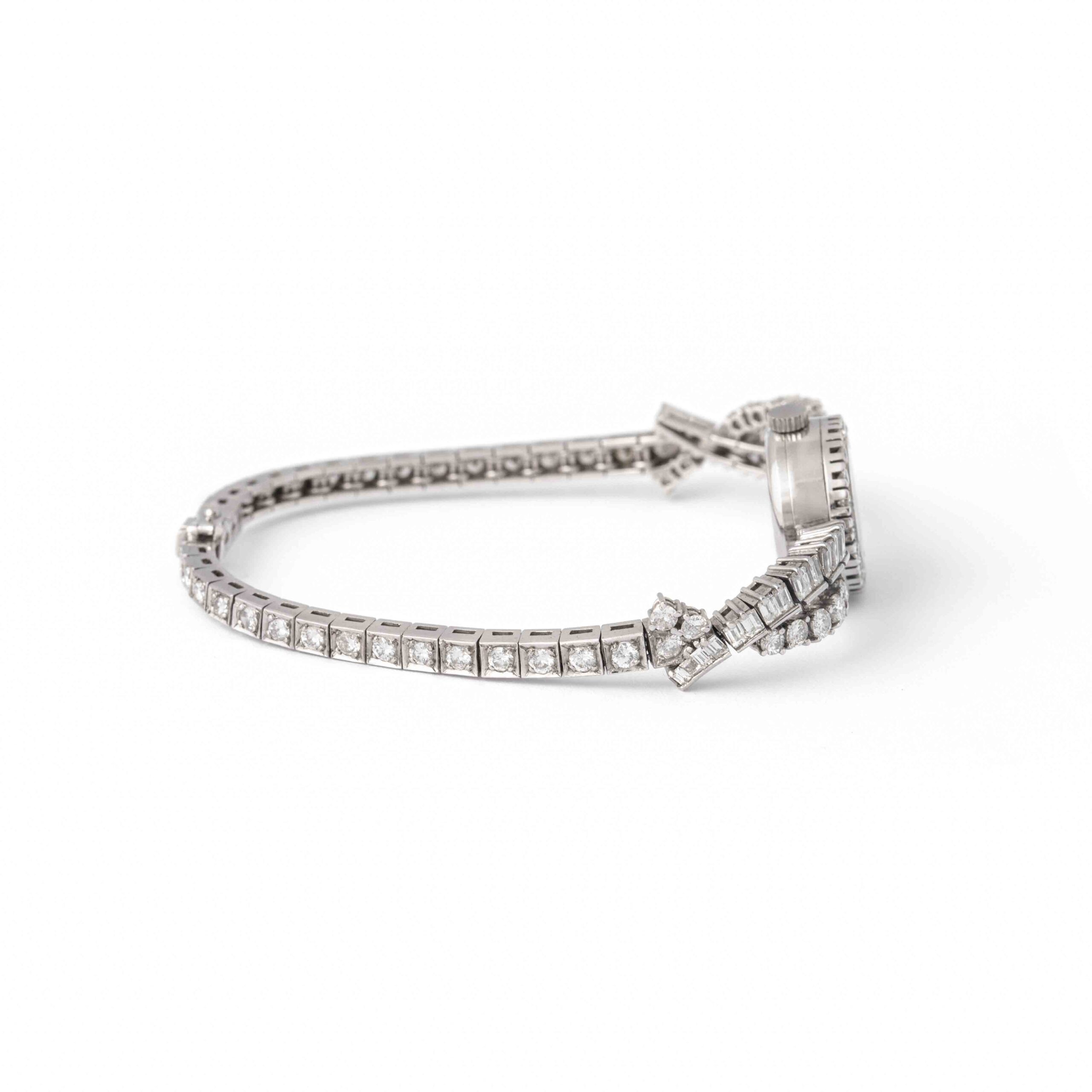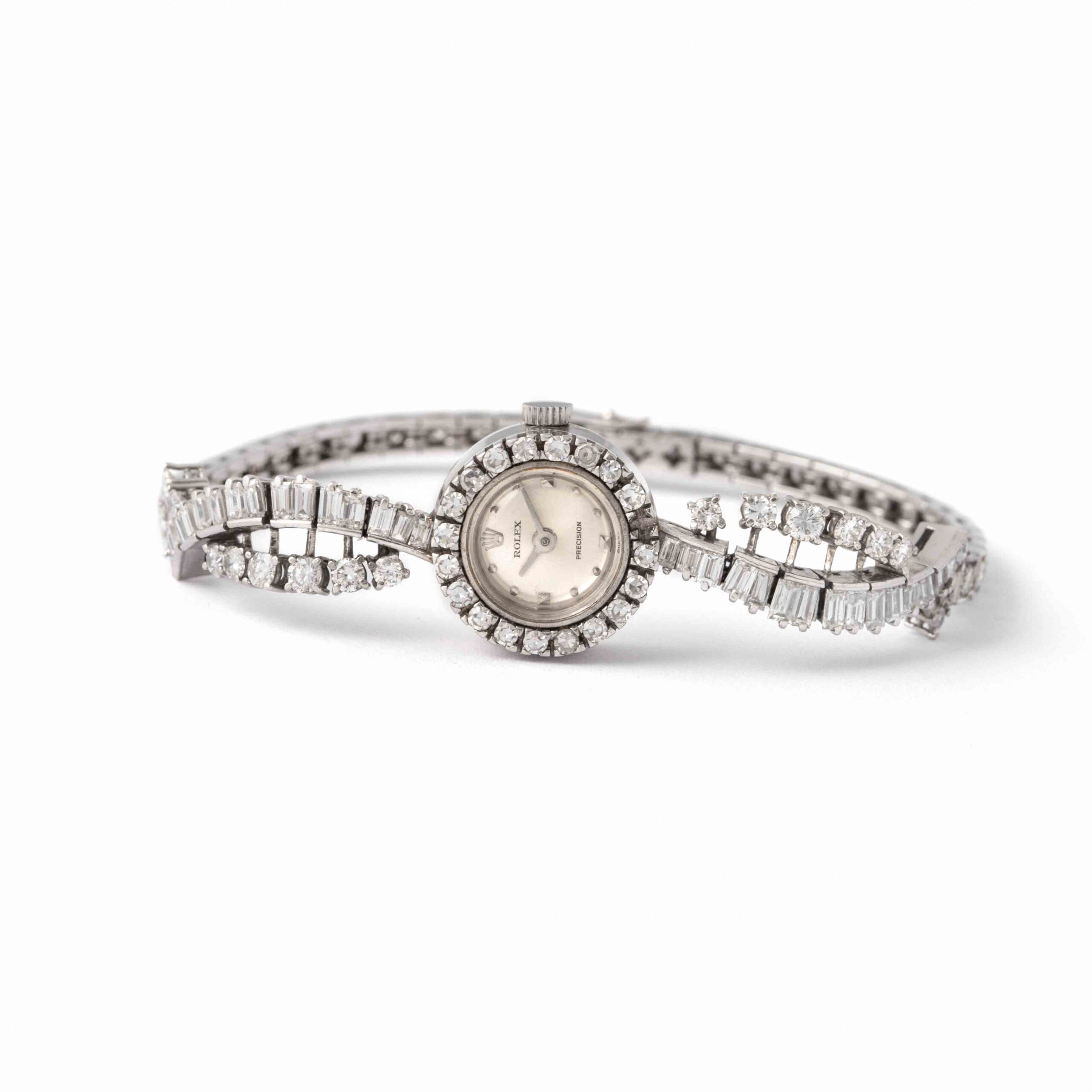 The Rolex Diamond Round and Baguette Cut on White Gold 18K wristwatch is a luxurious timepiece crafted with precision.