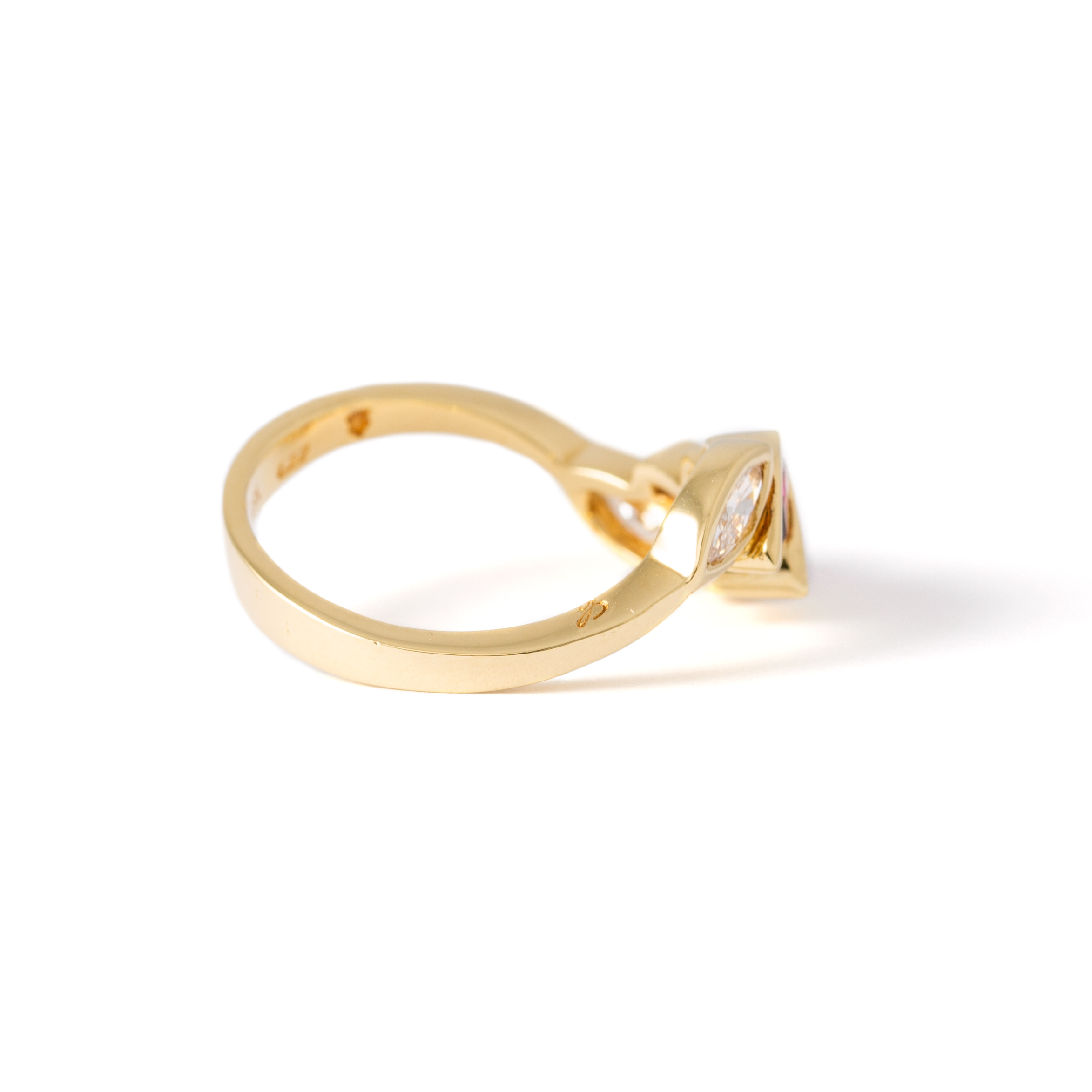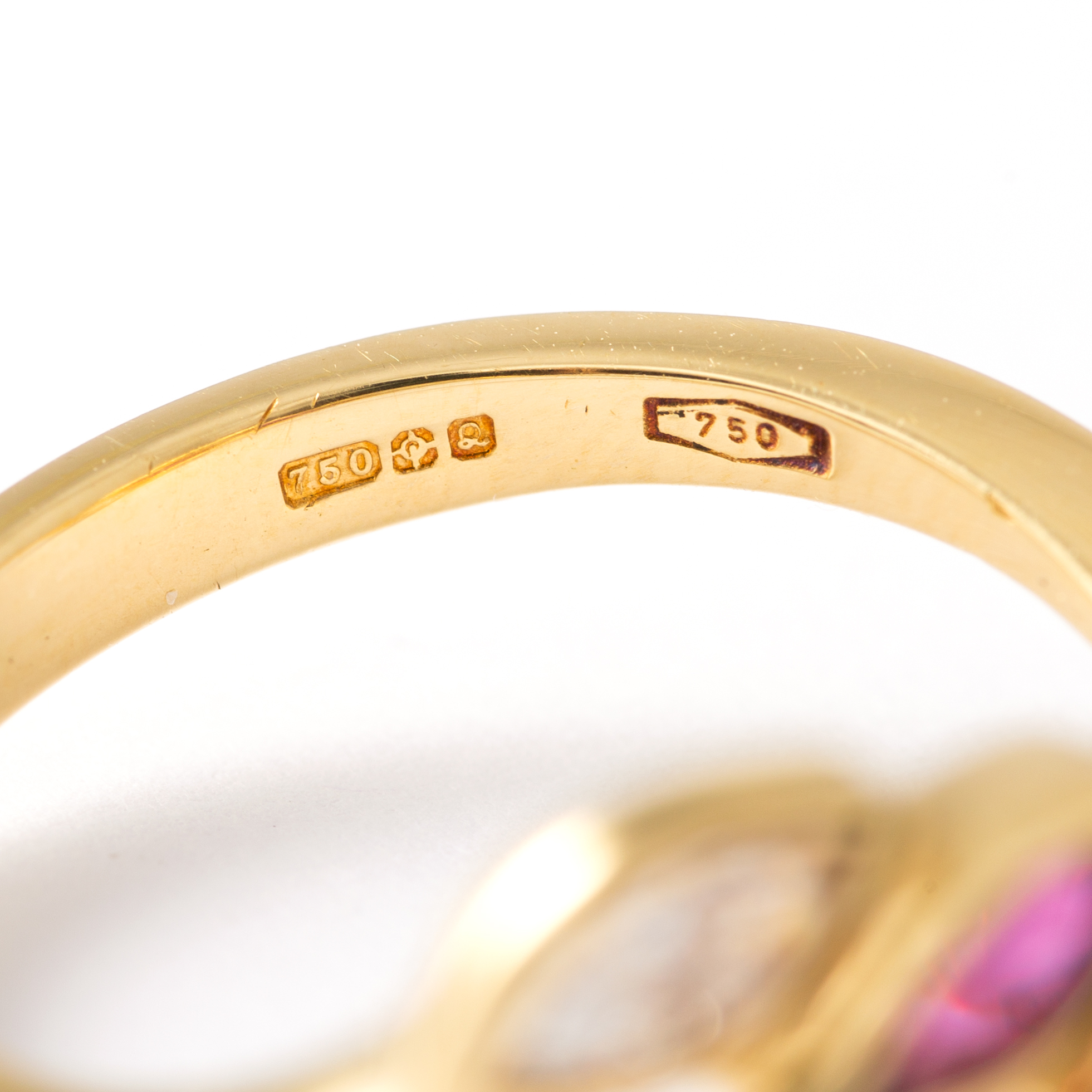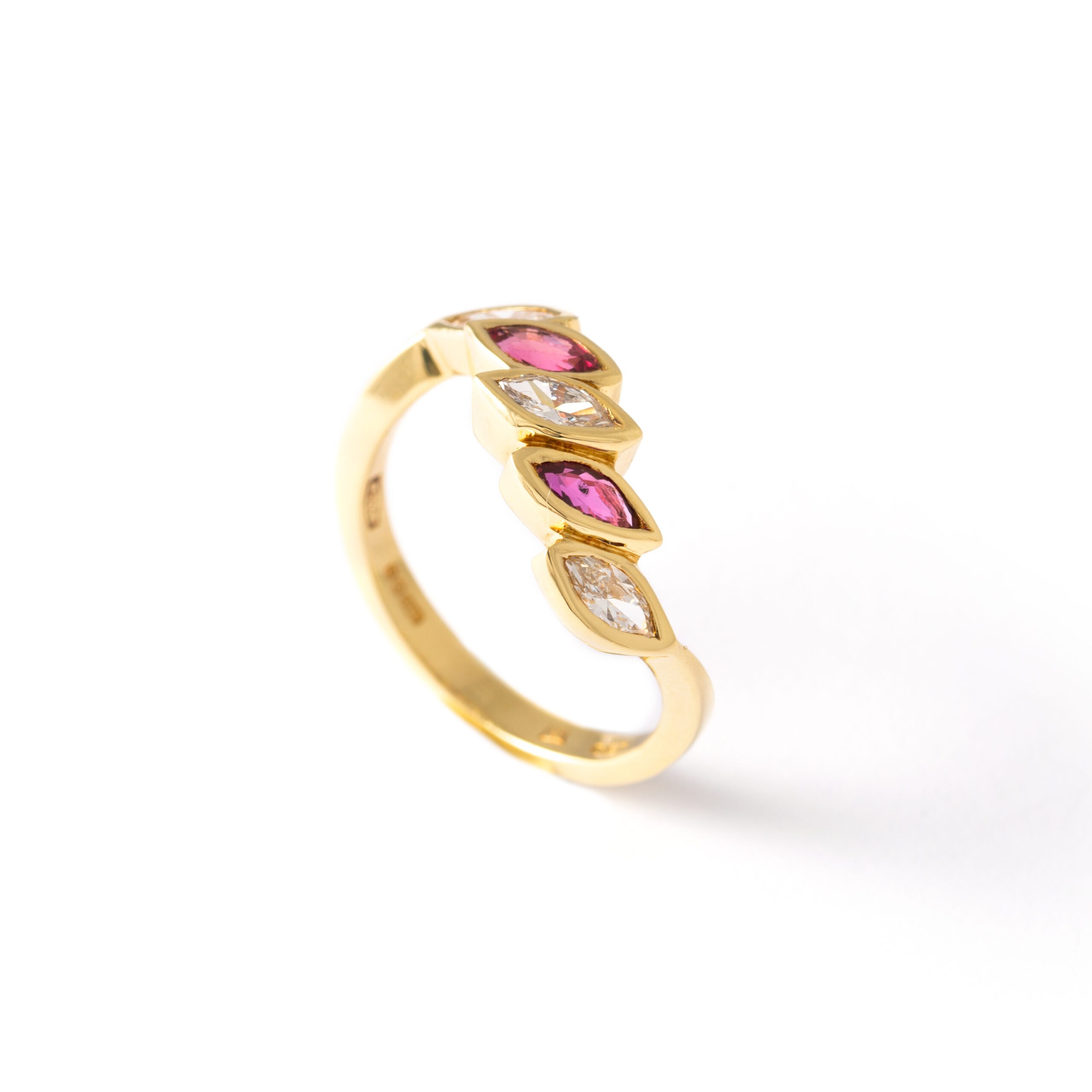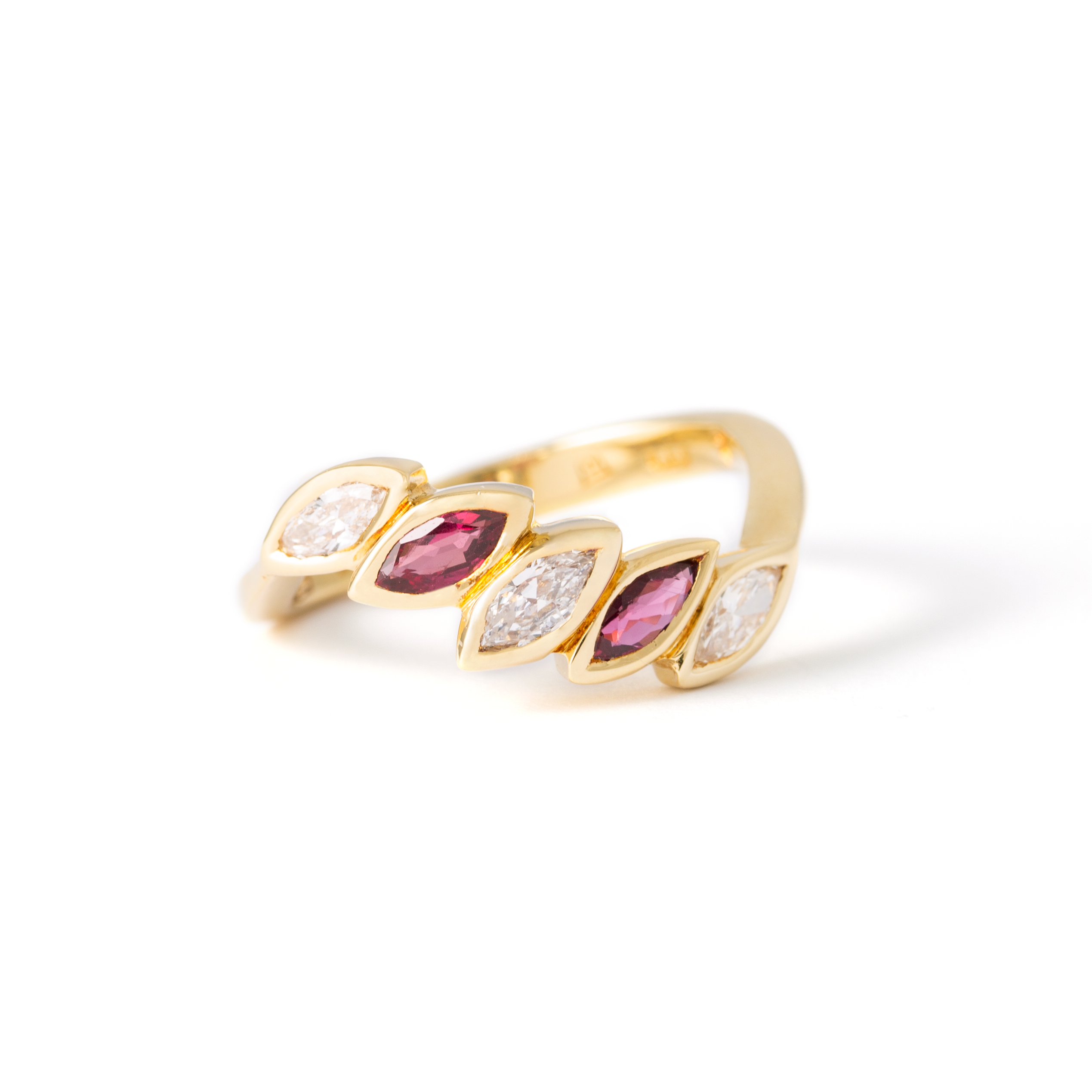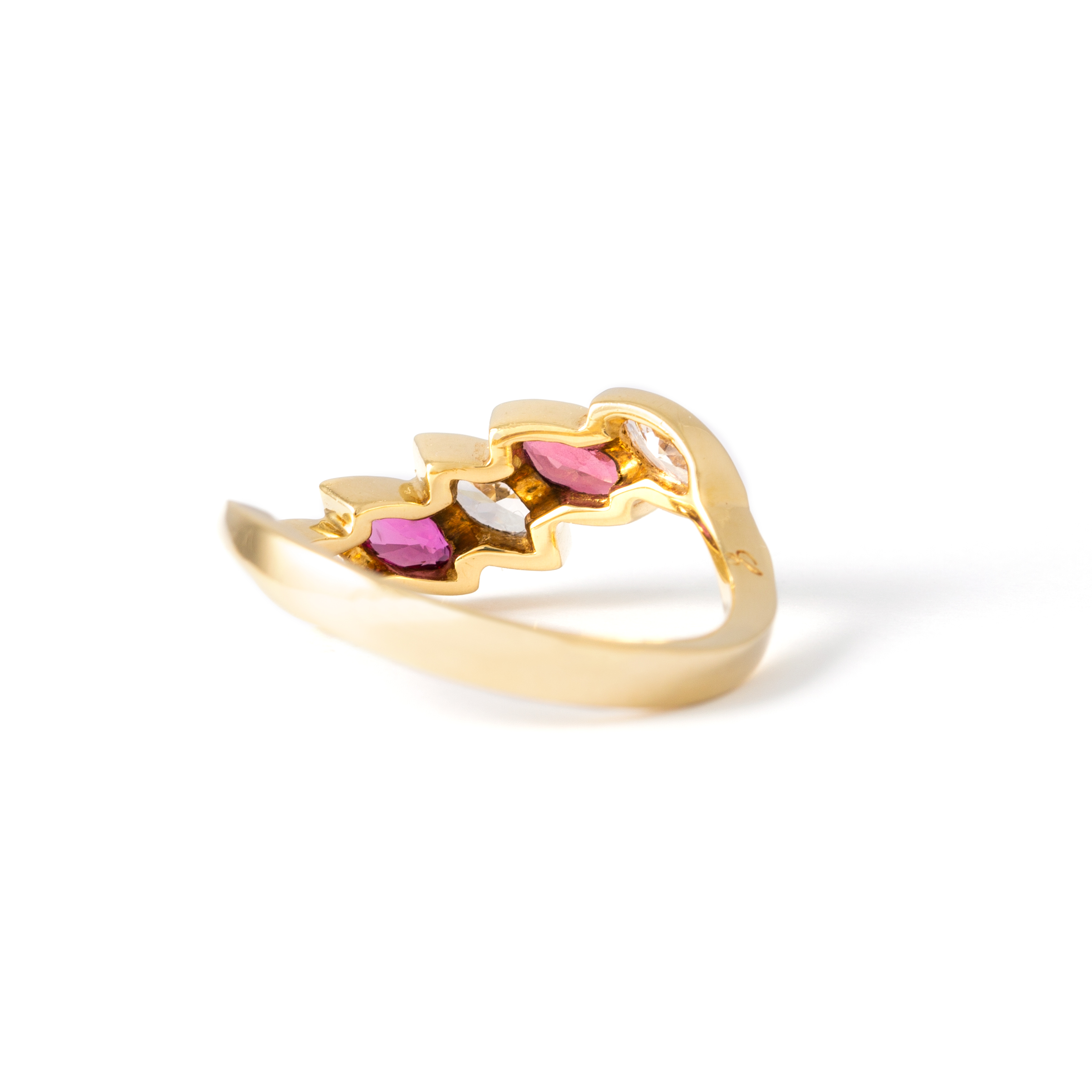 Ring in 18kt yellow gold set with 2 marquise cut rubies 0.52 cts and3 marquise cut diamonds 0.51 cts