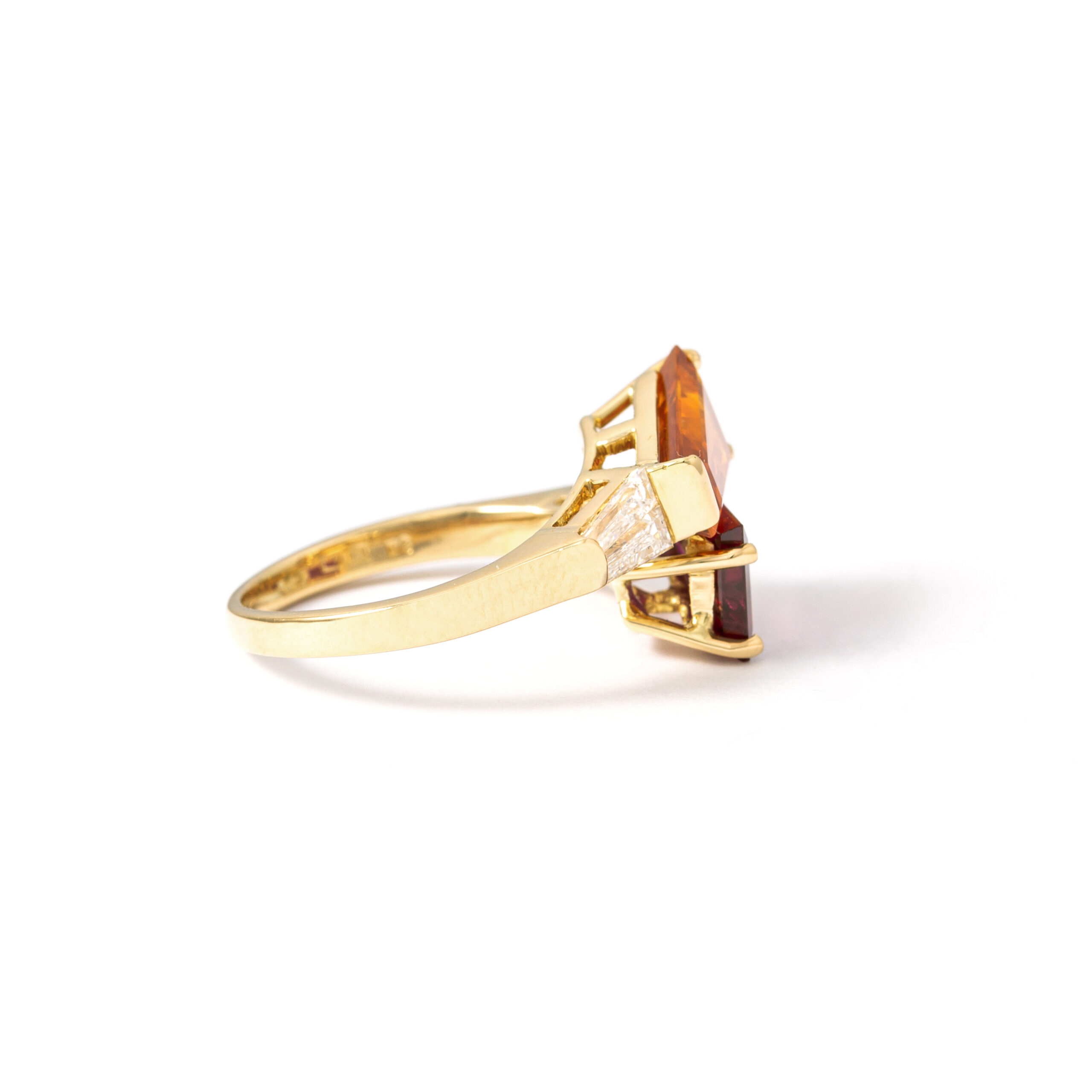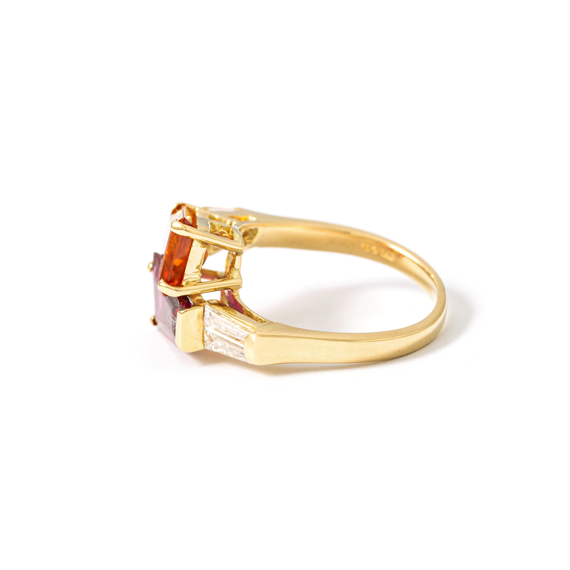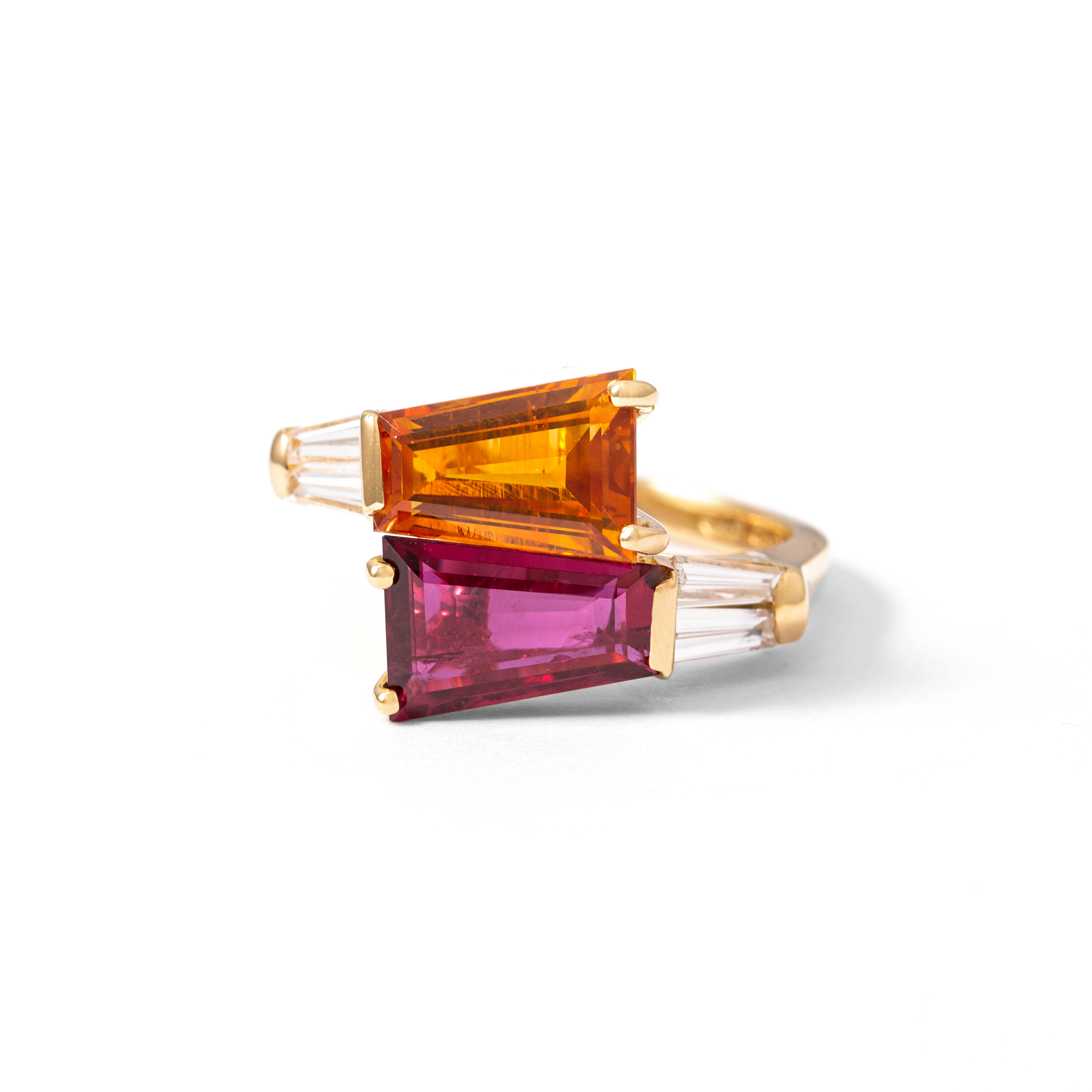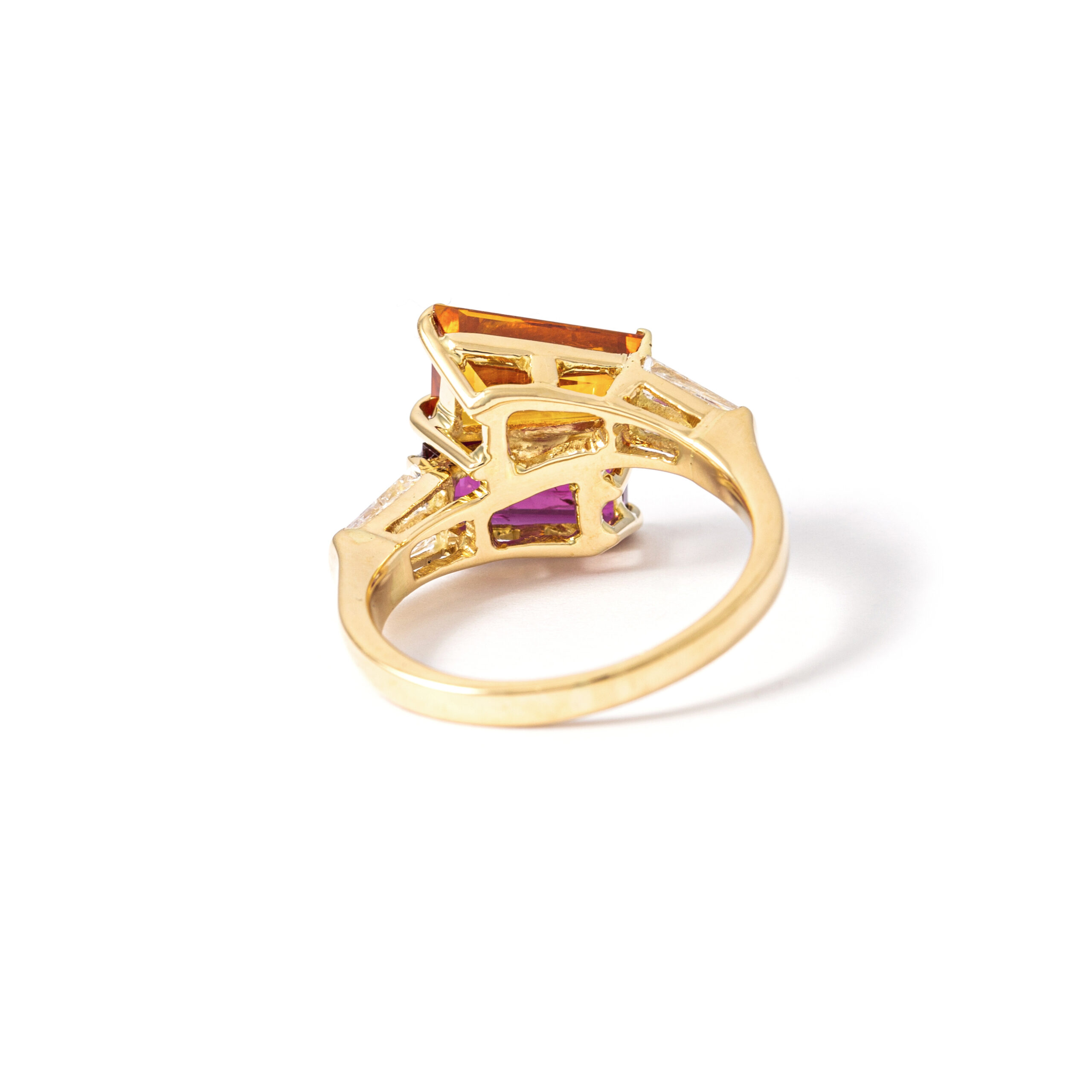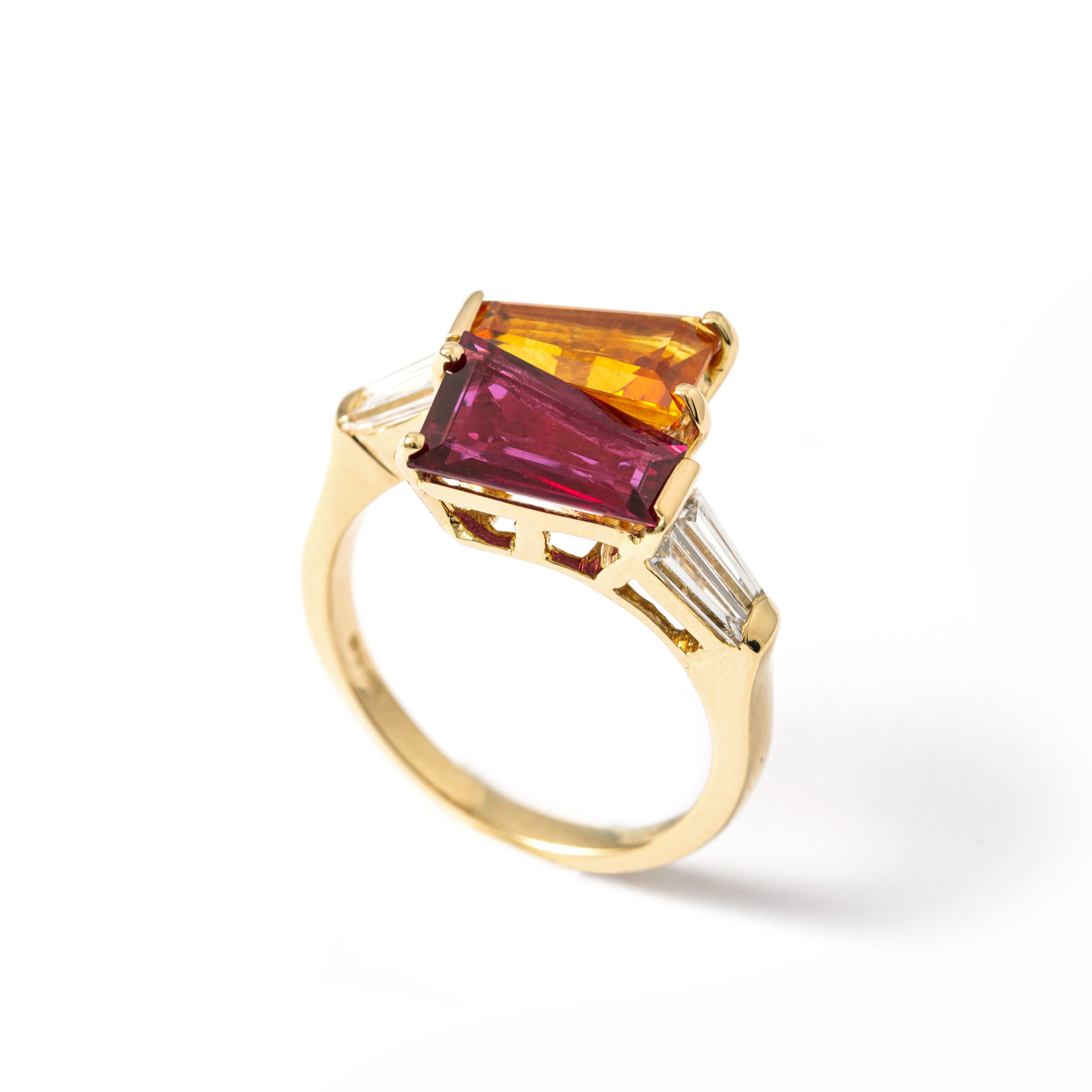 Ring in 18kt yellow gold set with one ruby 1.73 cts, one yellow sapphire 2.25 cts and 4 diamonds 0.53 cts