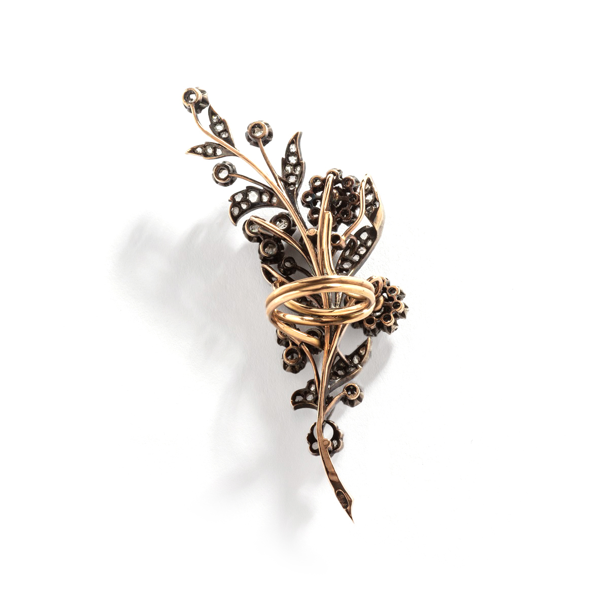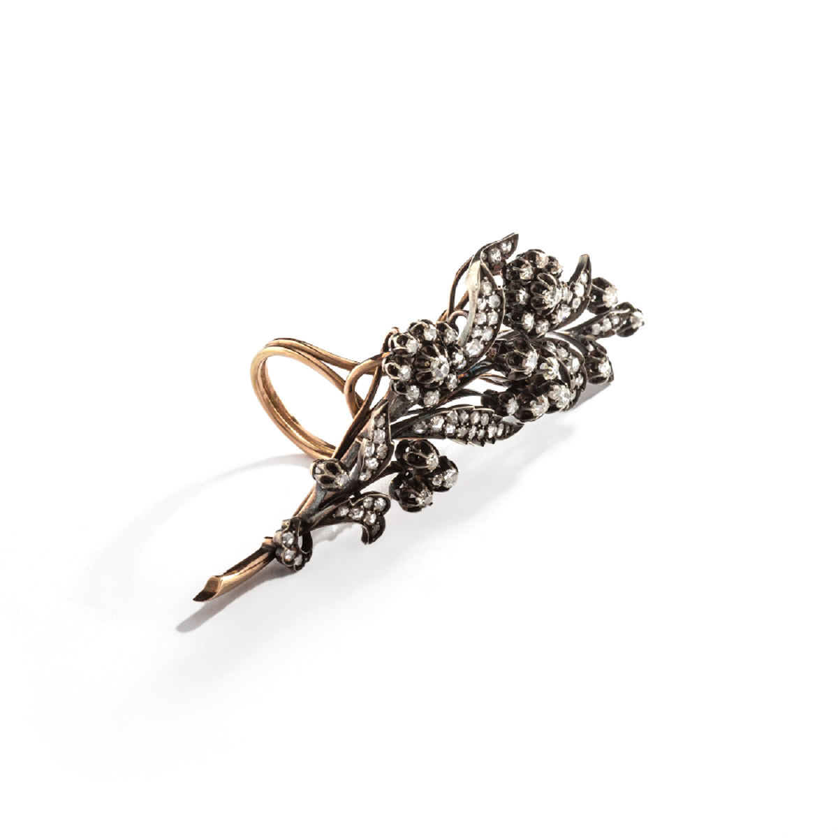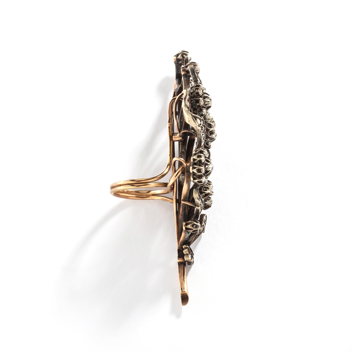 The centerpiece of this magnificent ring is a mesmerizing rose-cut old-mine cut diamond, radiating a brilliance that is simply enchanting. Embracing the floral theme, the diamond is skillfully set amidst delicate petals, forming a captivating flower design that exudes a sense of vintage charm.