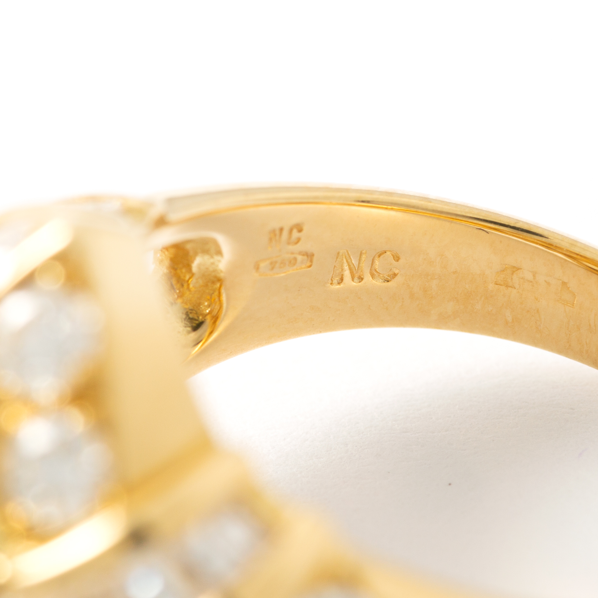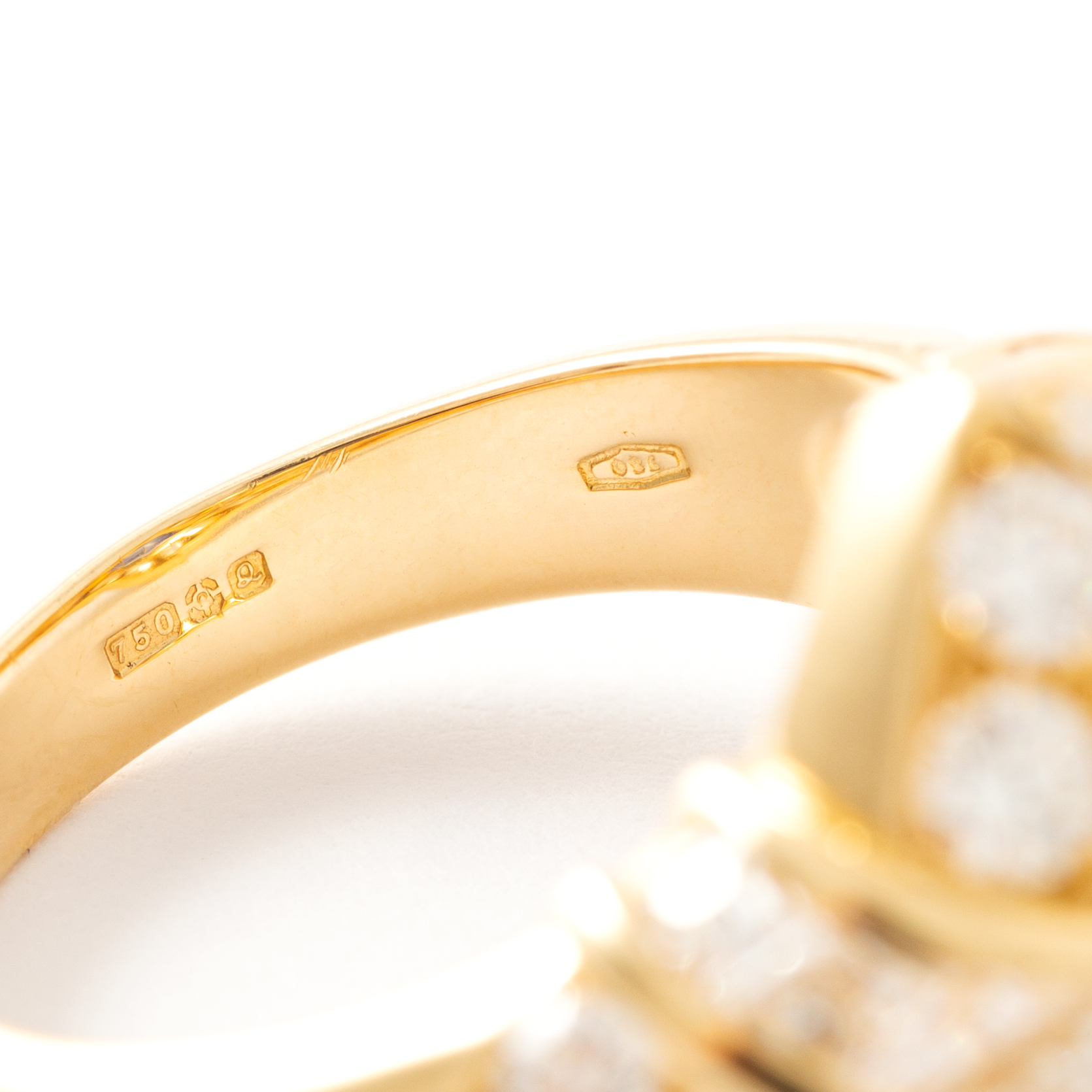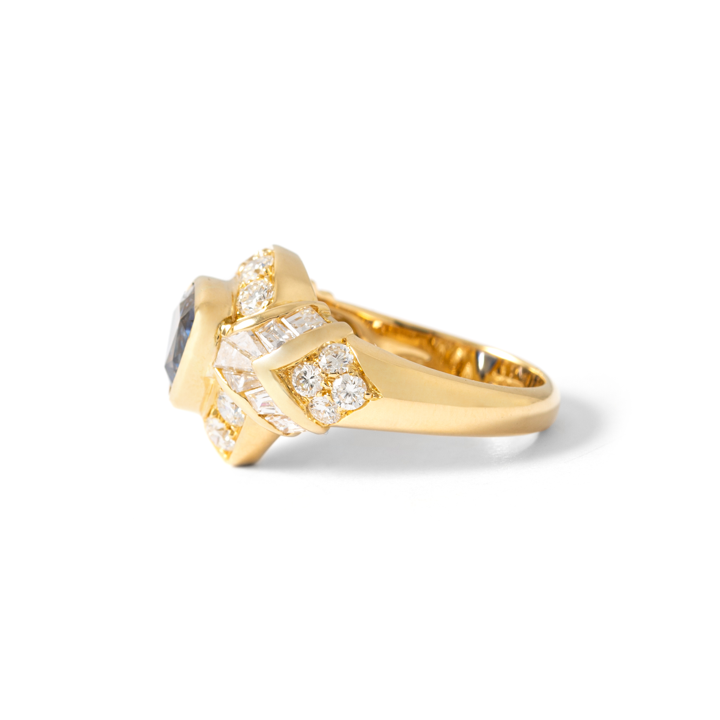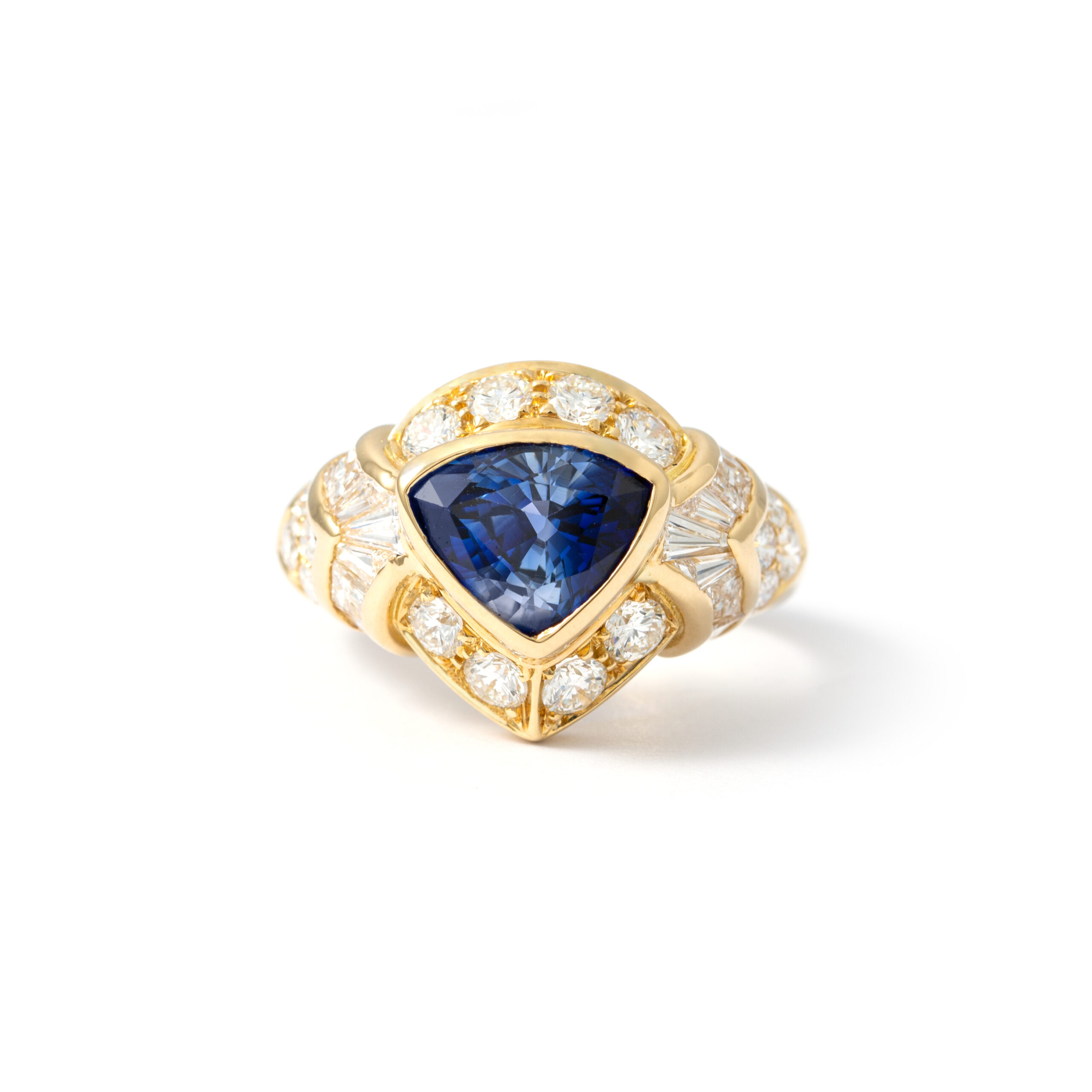 Ring in 18kt yellow gold set with one sapphire 3.14 cts, 0.79 cts and tapers cut diamonds 1.11 cts