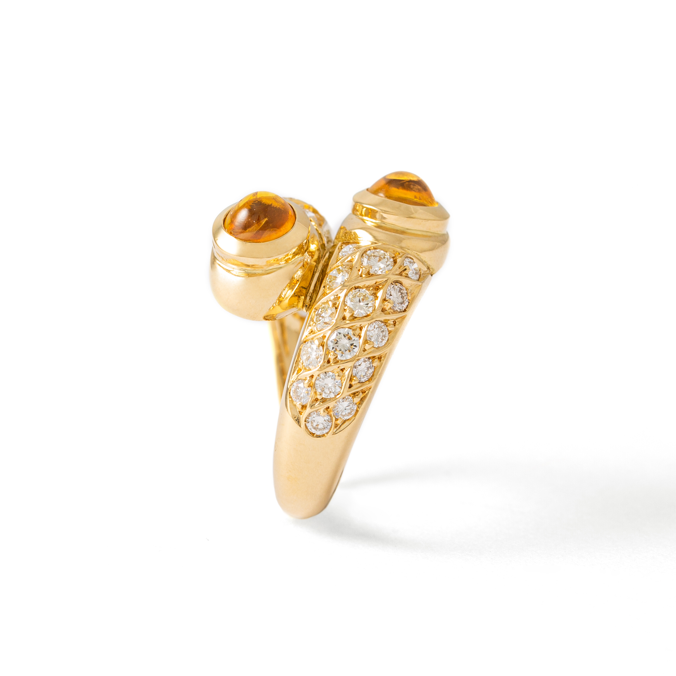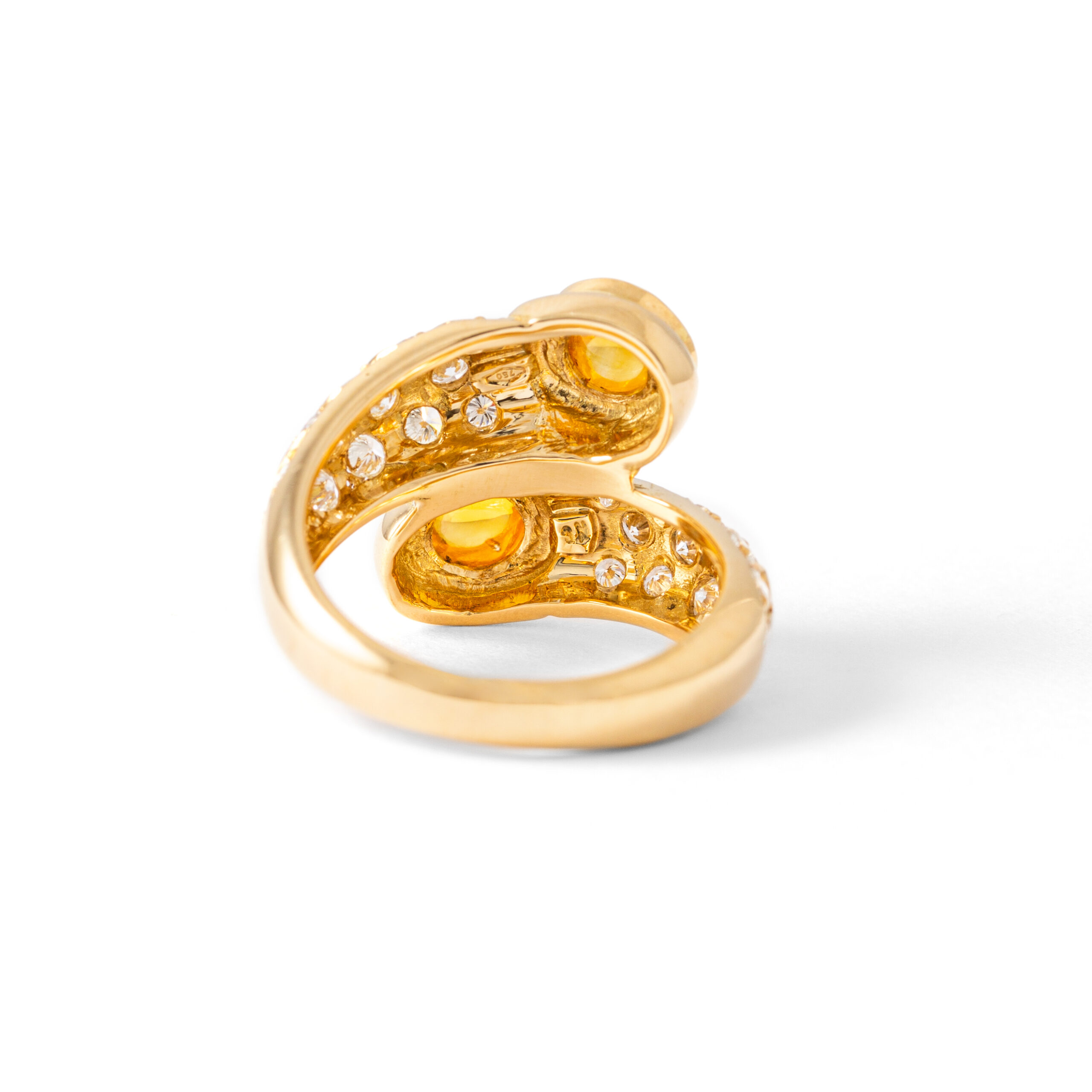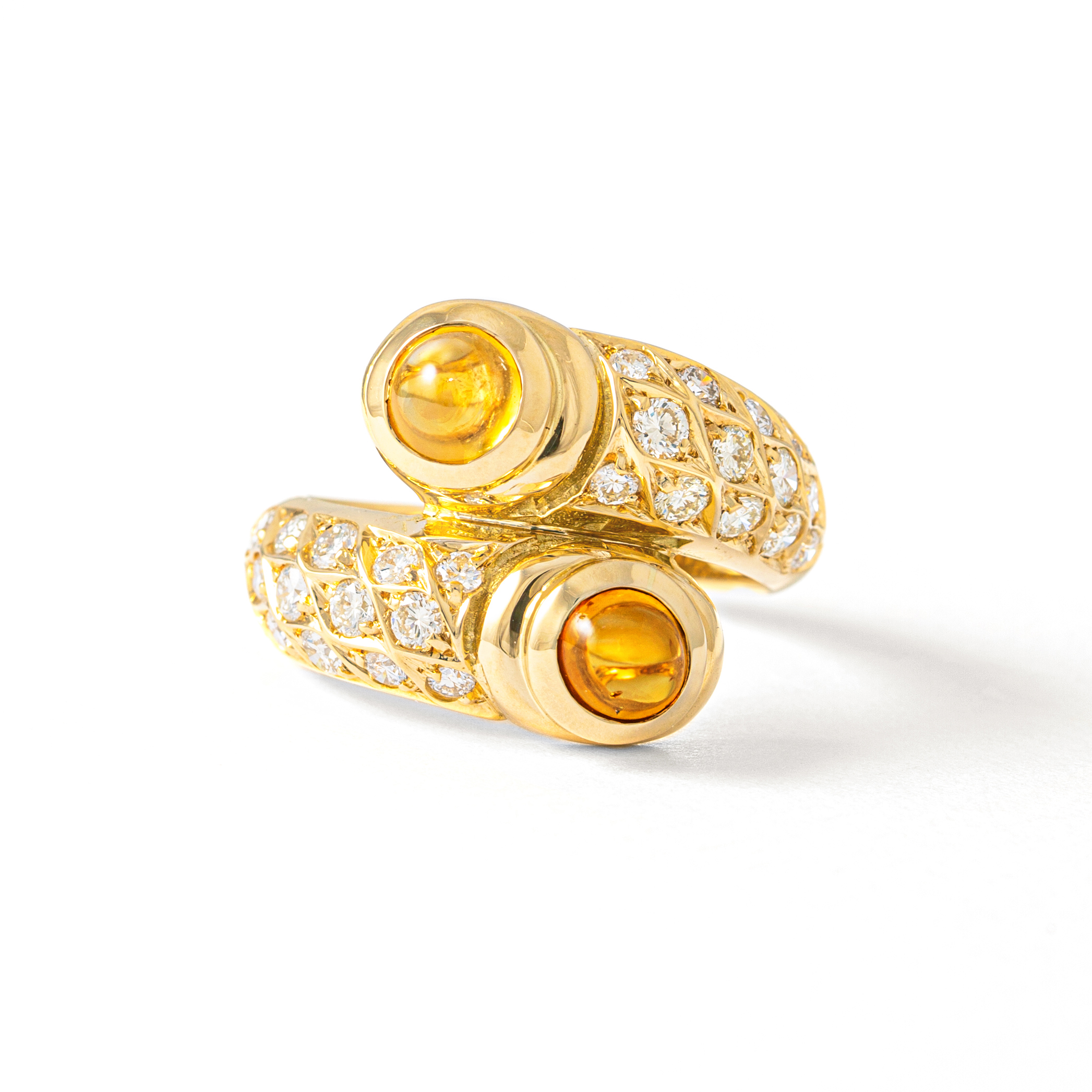 Ring in 18kt yellow gold set with 2 yellow cabochon cut sapphires 1.71 cts and 30 diamonds 0.68 cts