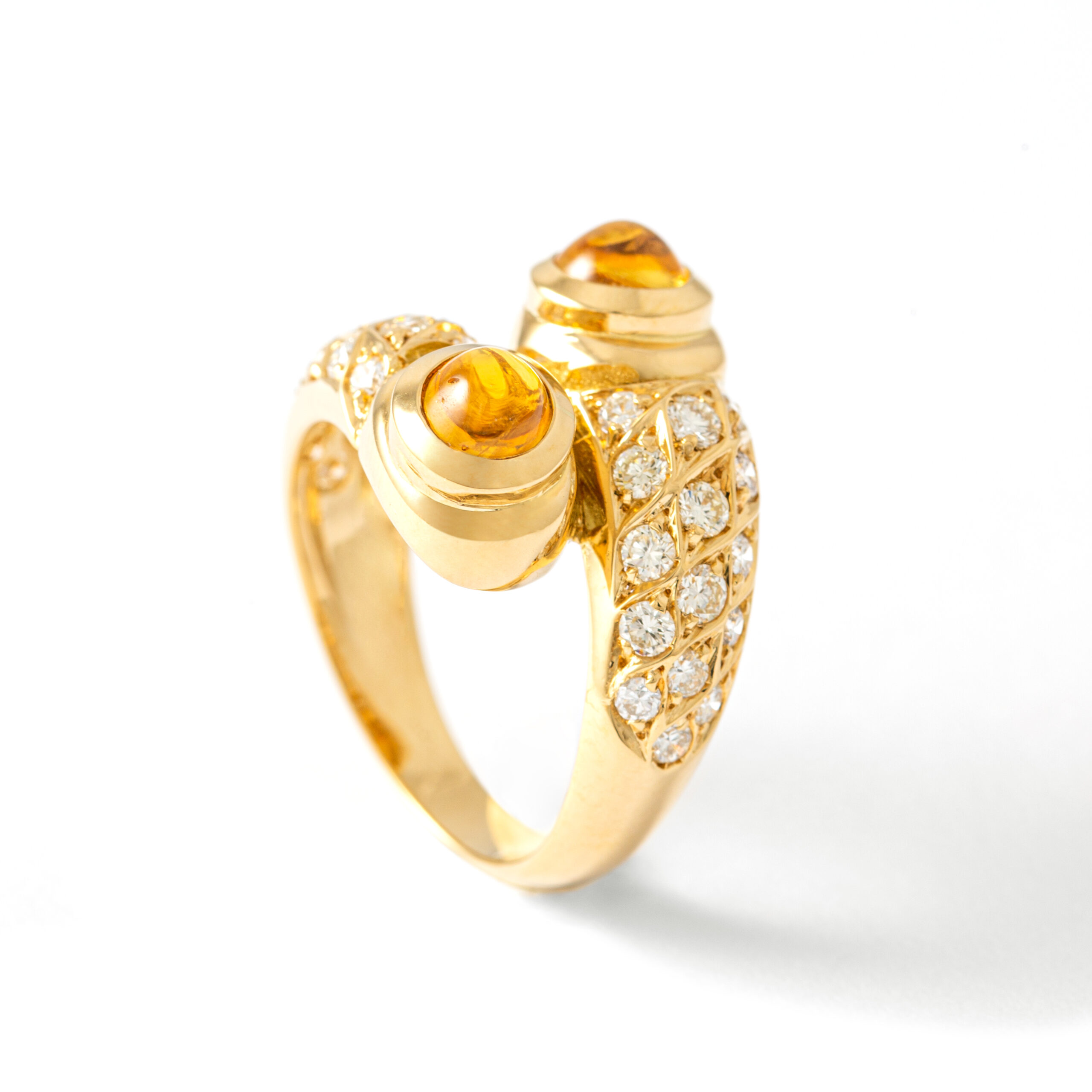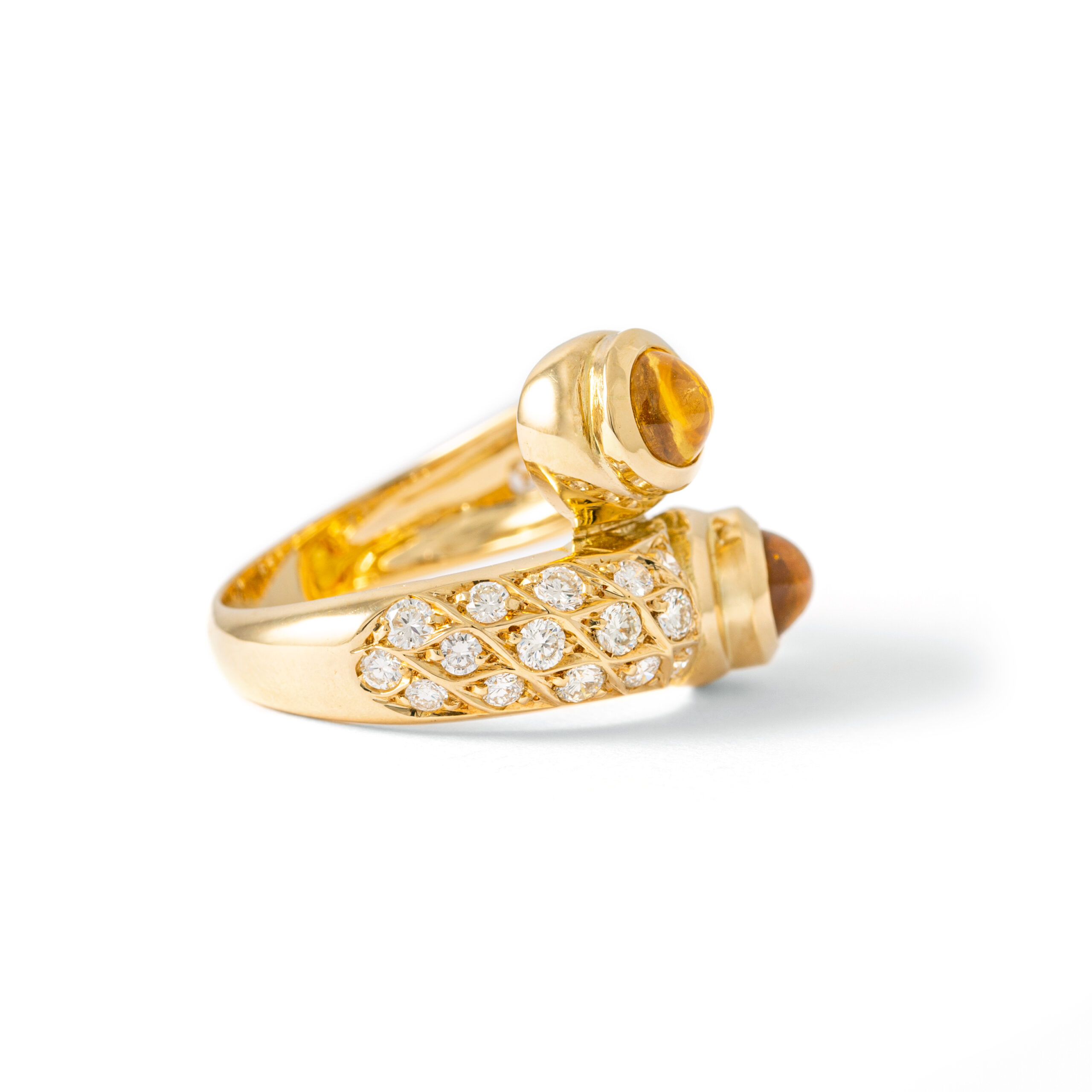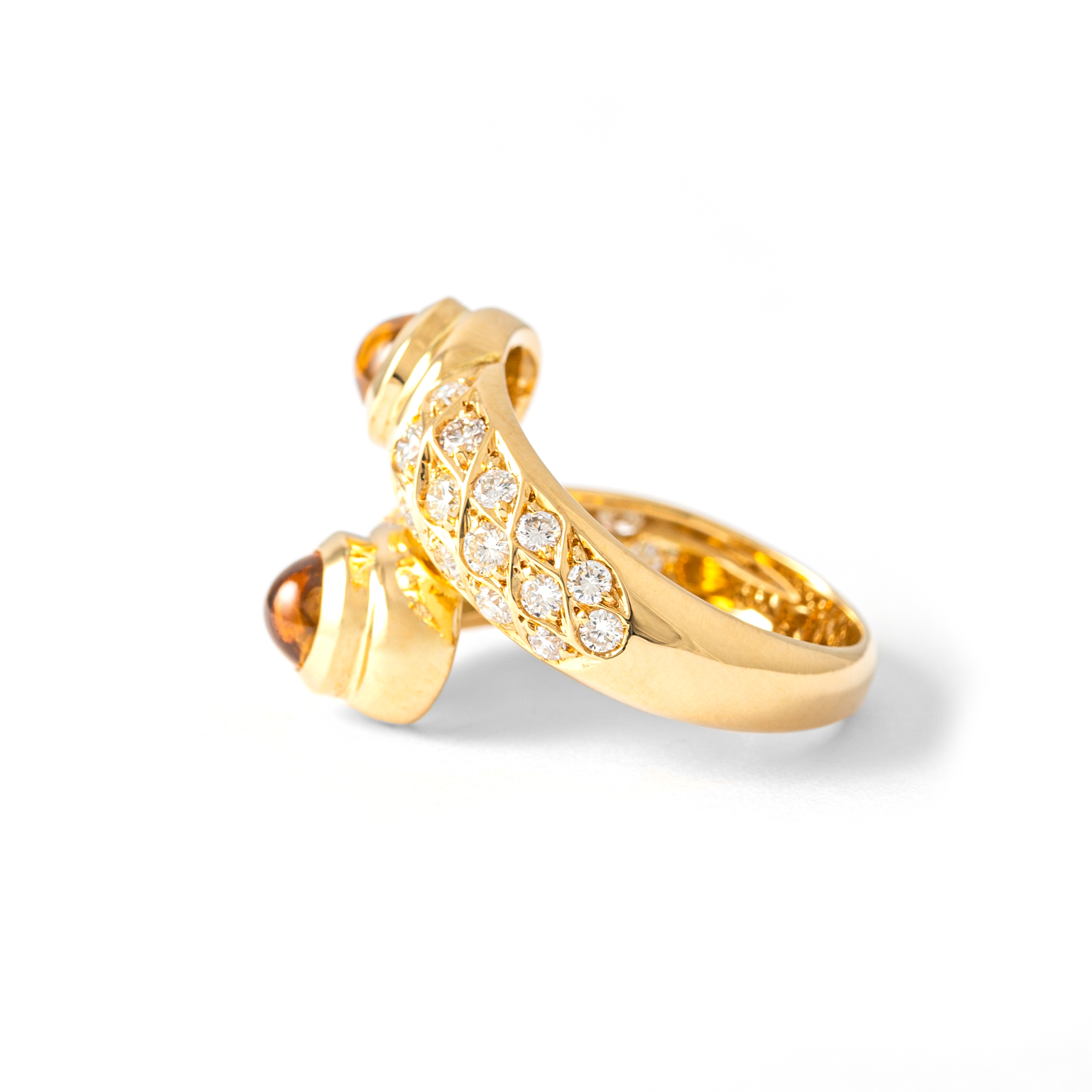Ring in 18kt yellow gold set with 2 yellow cabochon cut sapphires 1.71 cts and 30 diamonds 0.68 cts