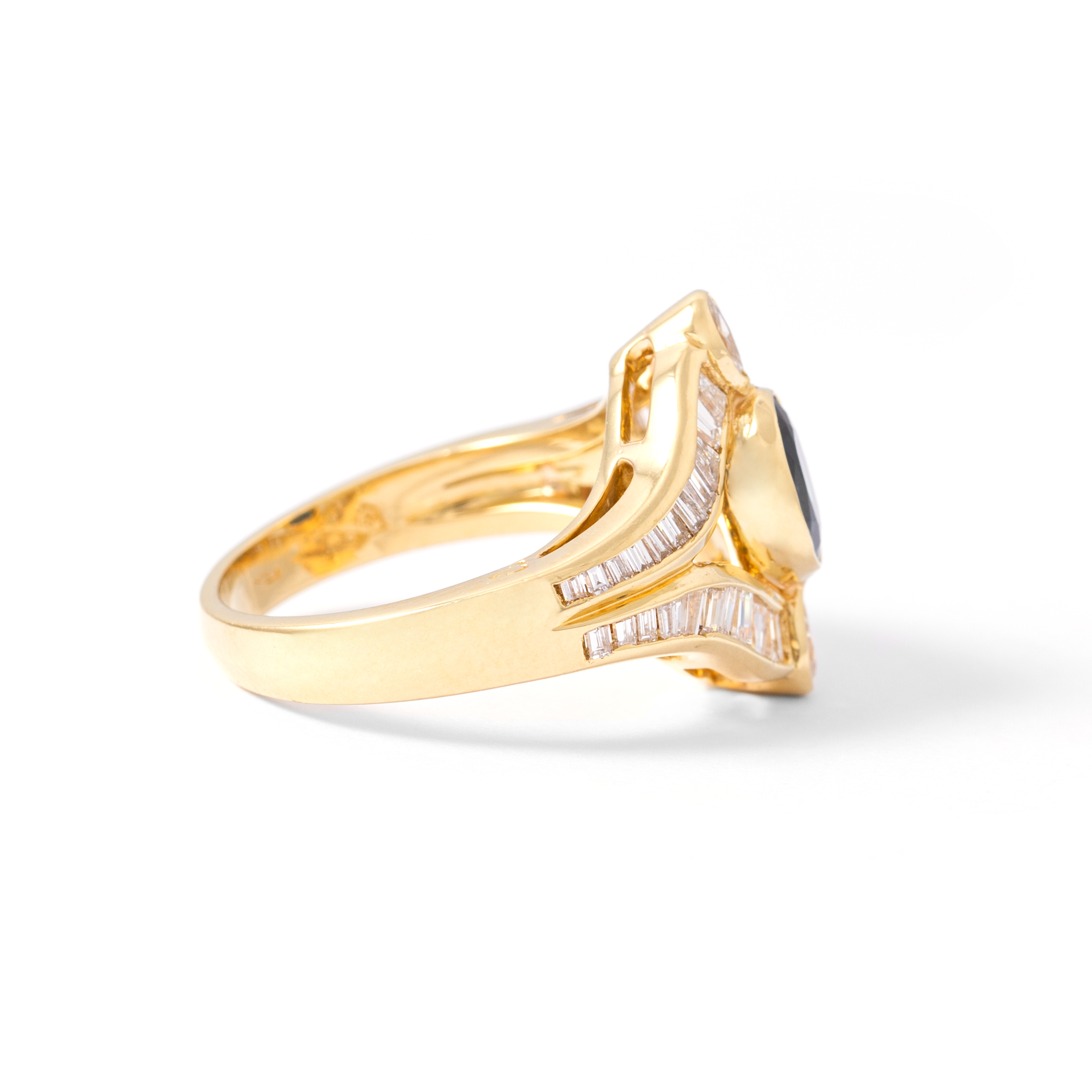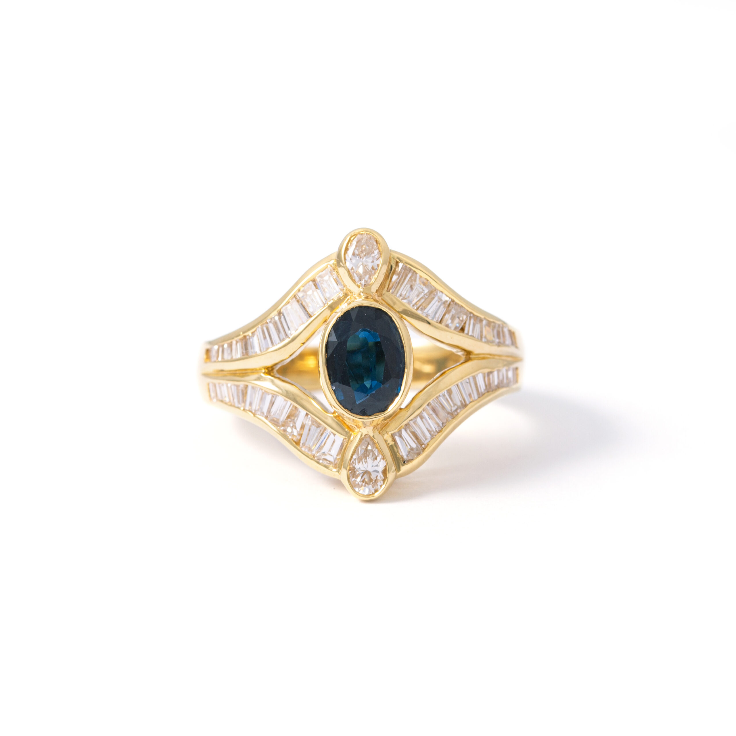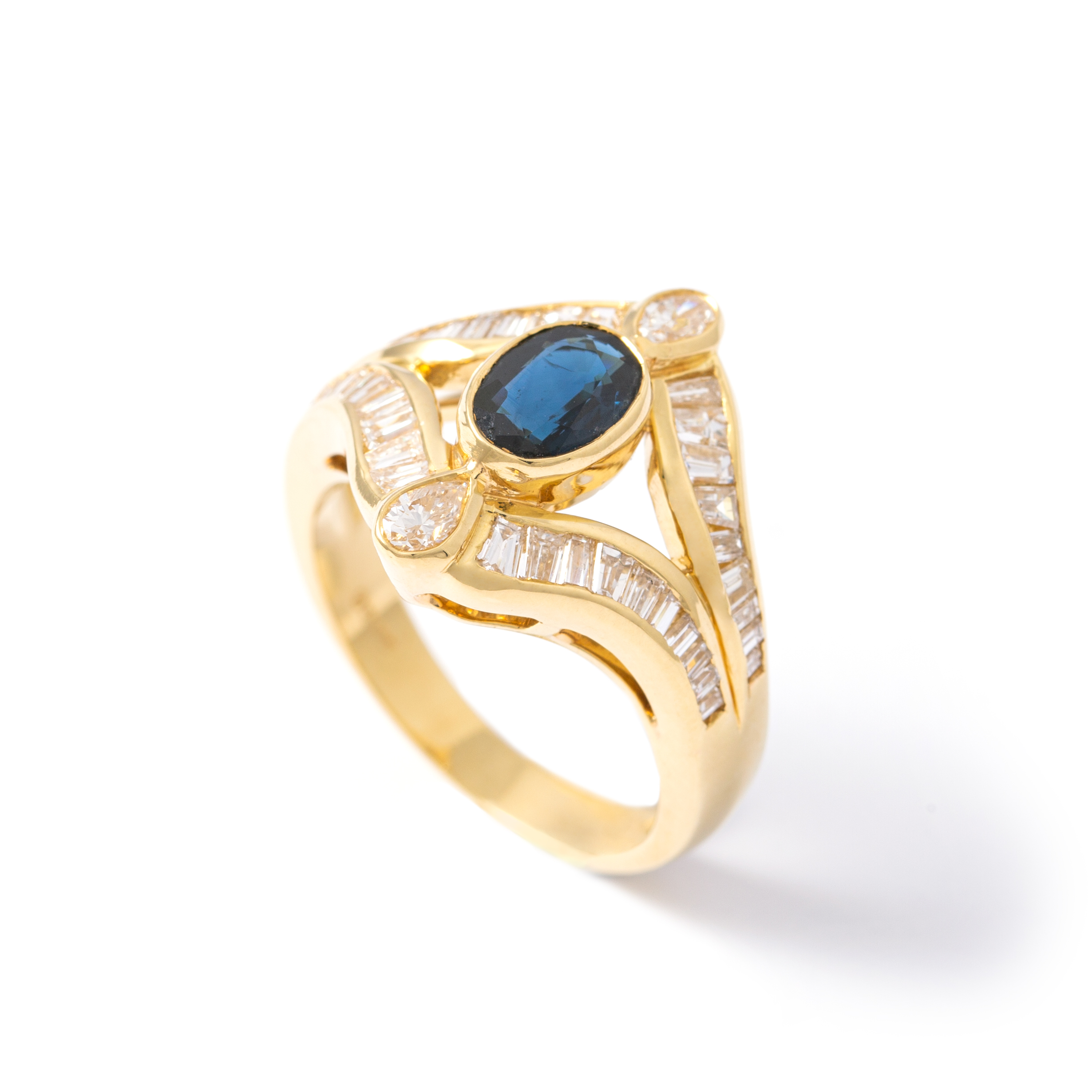 Ring in 18kt yellow gold set with one oval cut sapphire 1.20 cts, 2 pear-shaped diamonds 0.18 cts and 40 tapers cut diamonds 2.30 cts