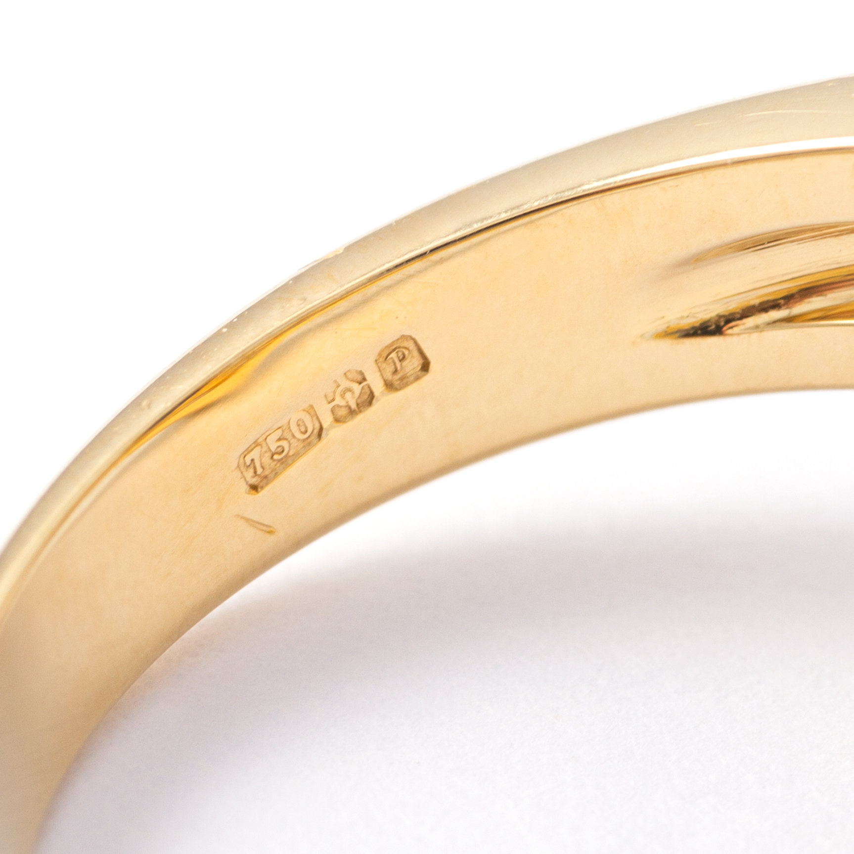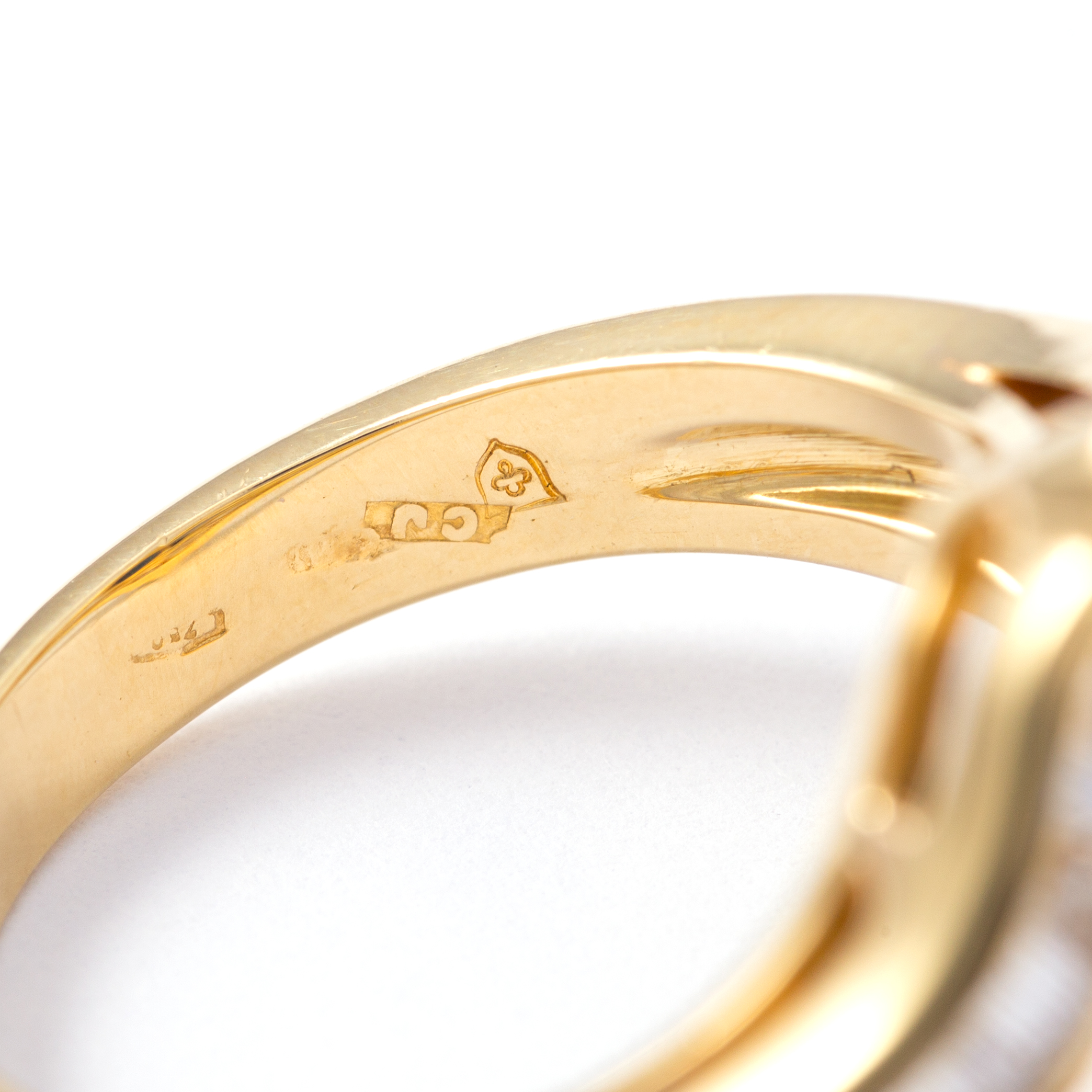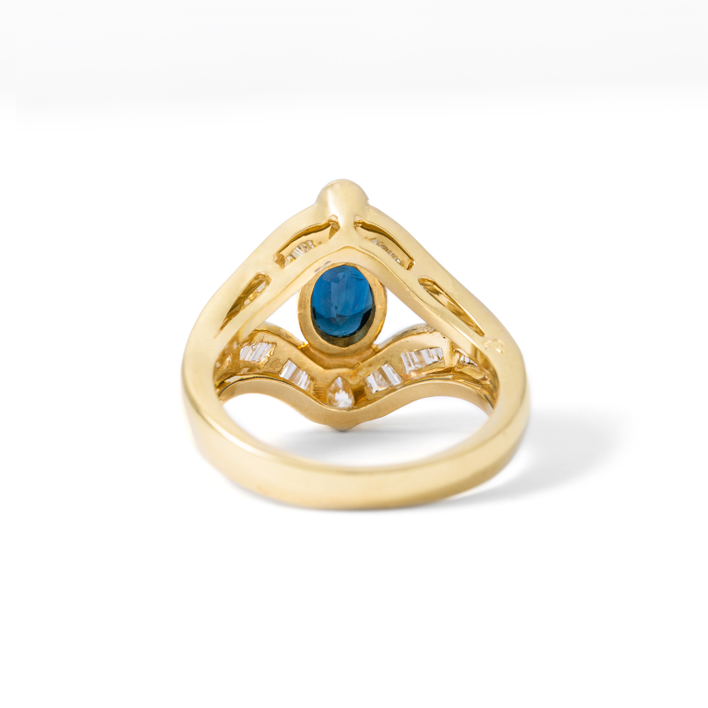 Ring in 18kt yellow gold set with one oval cut sapphire 1.20 cts, 2 pear-shaped diamonds 0.18 cts and 40 tapers cut diamonds 2.30 cts