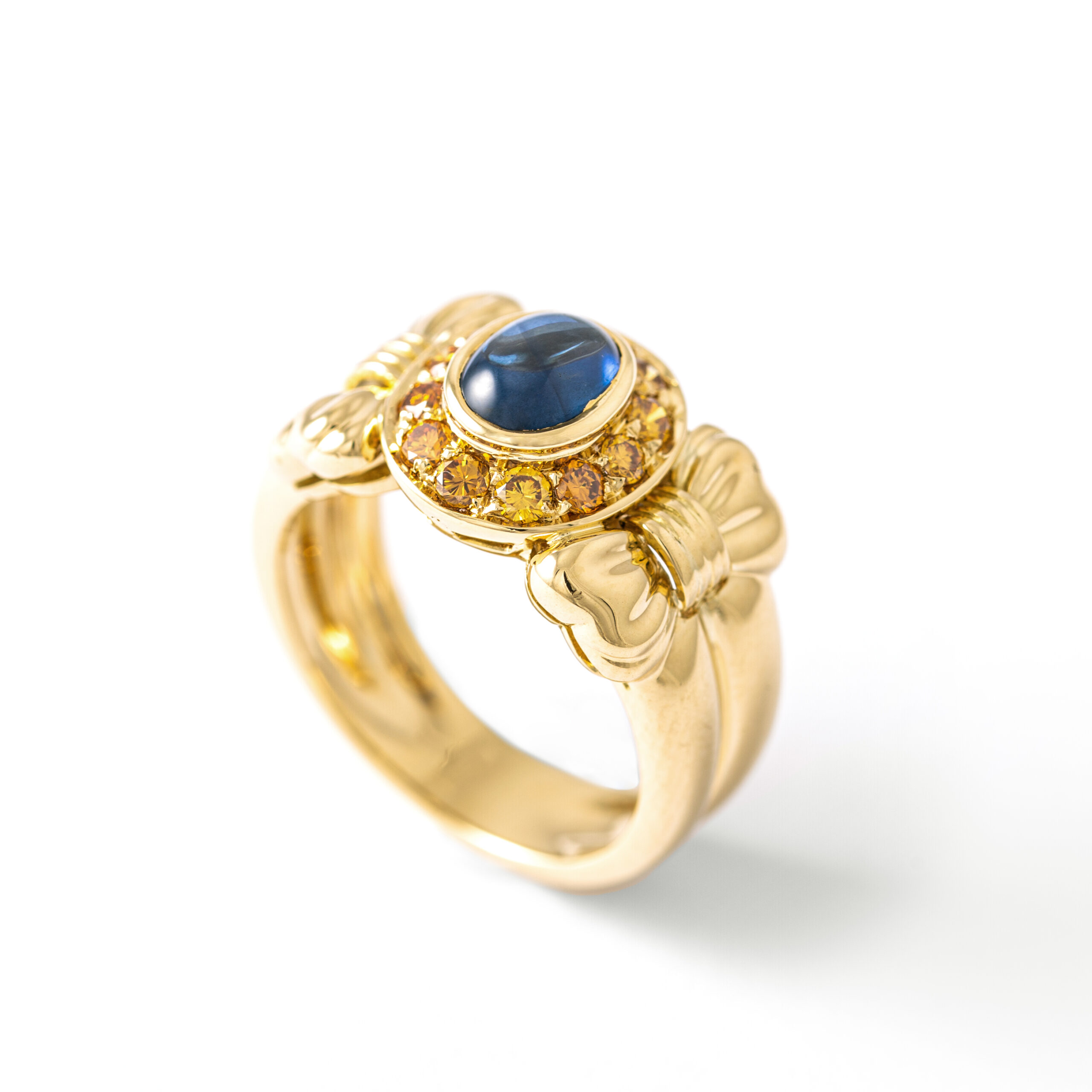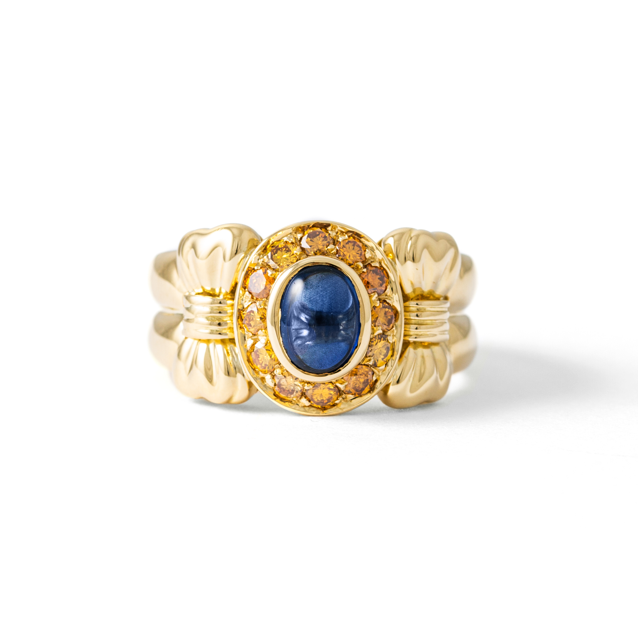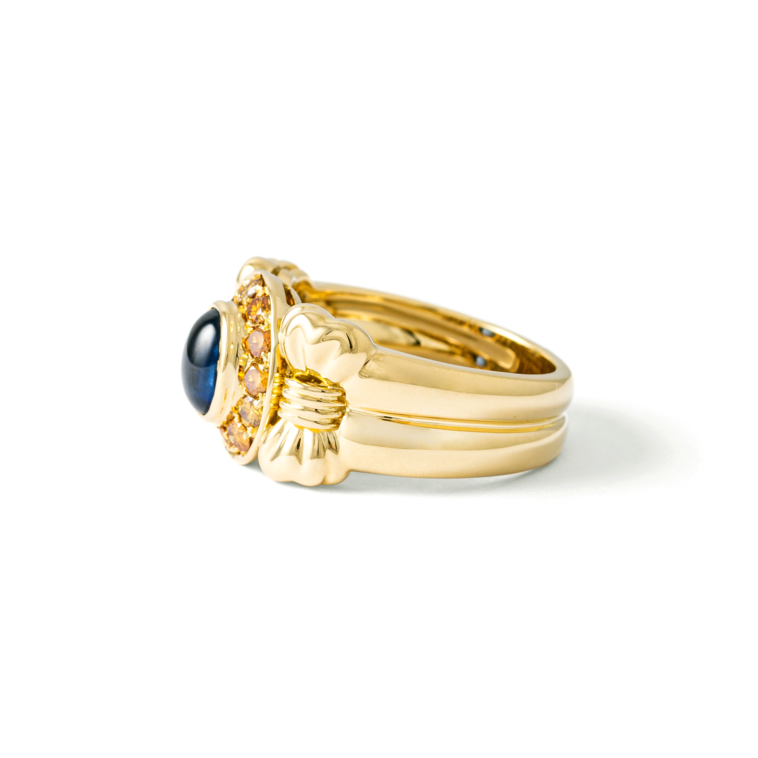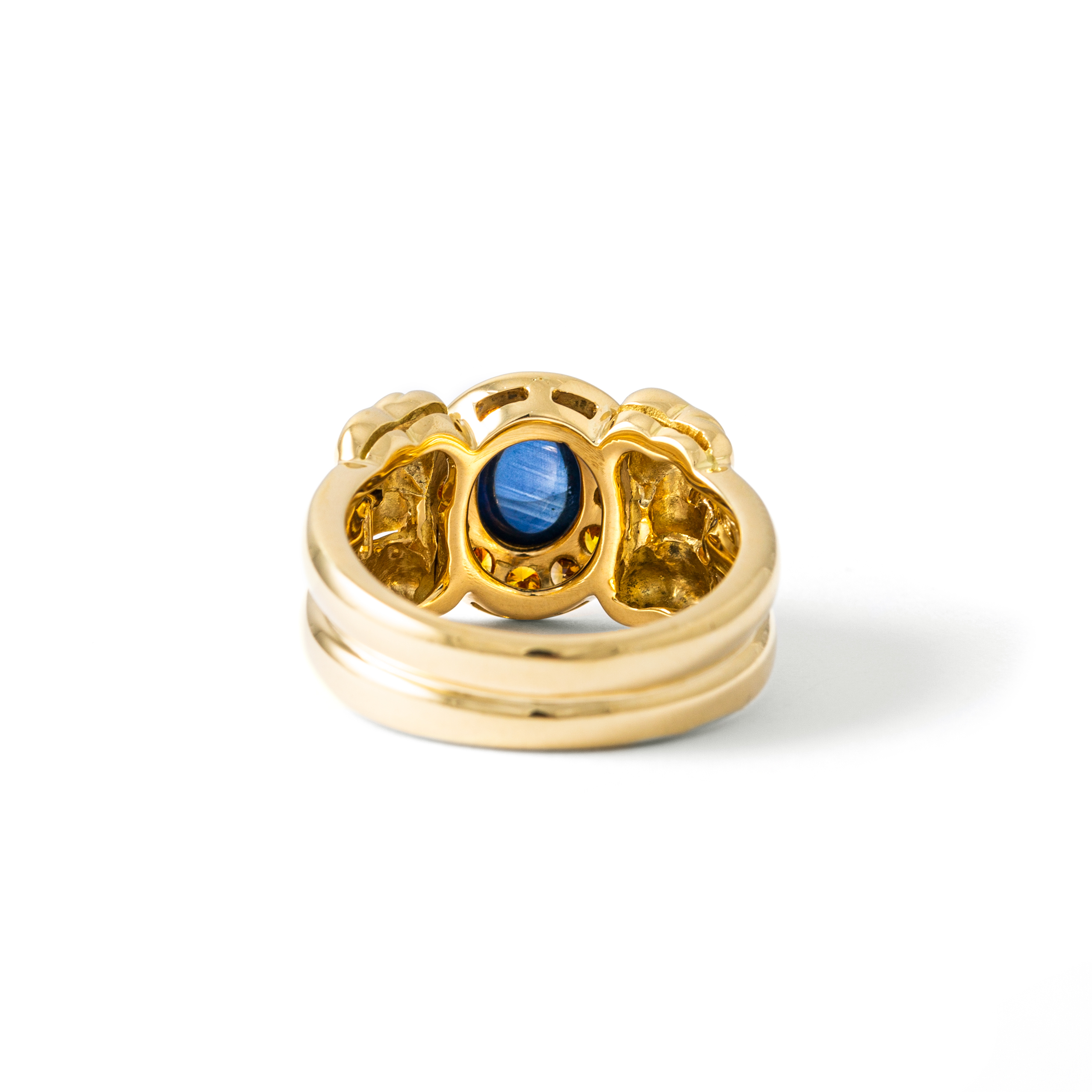 Ring in 18kt yellow gold set with one cabochon cut sapphire 1.32 cts and 12diamonds 0.44 cts