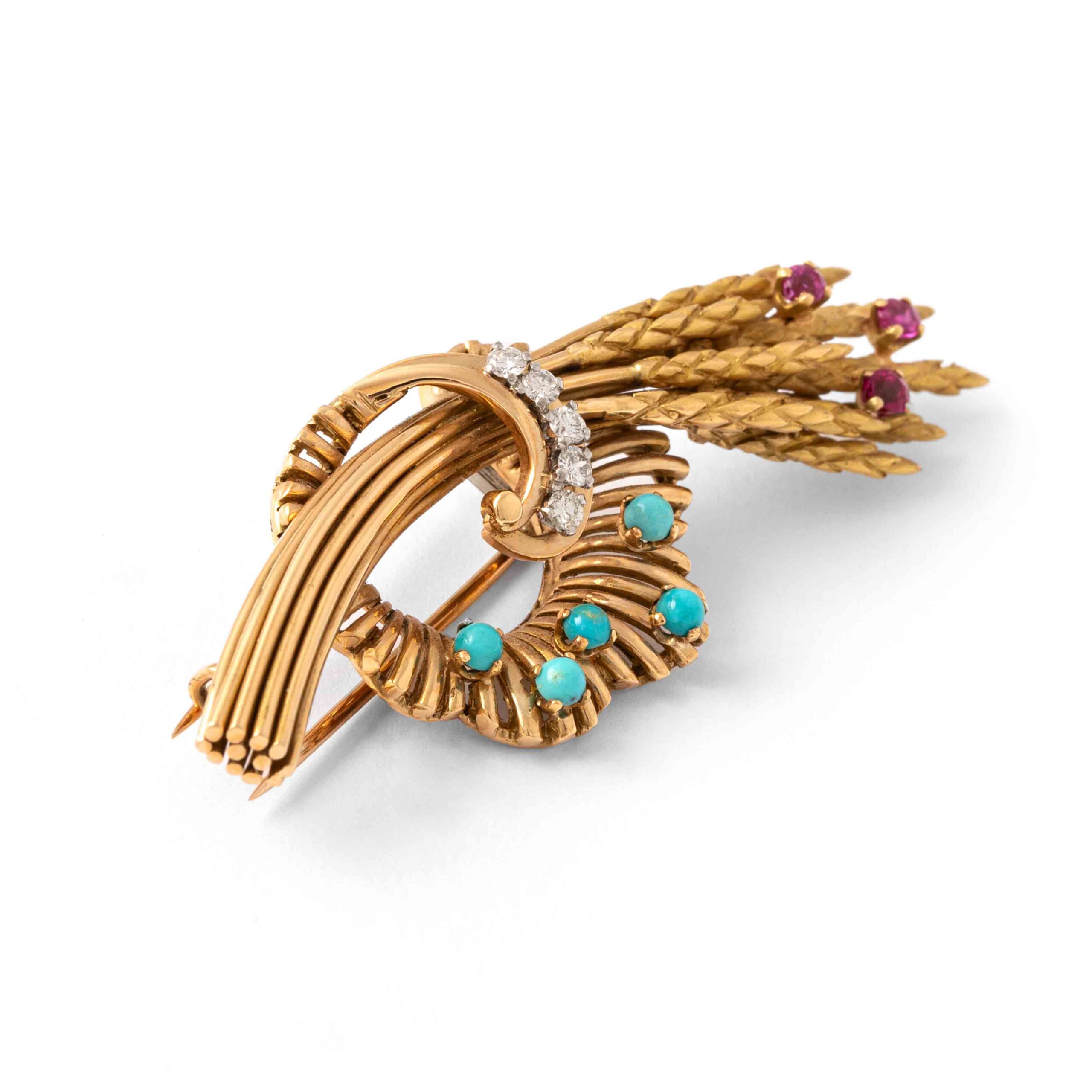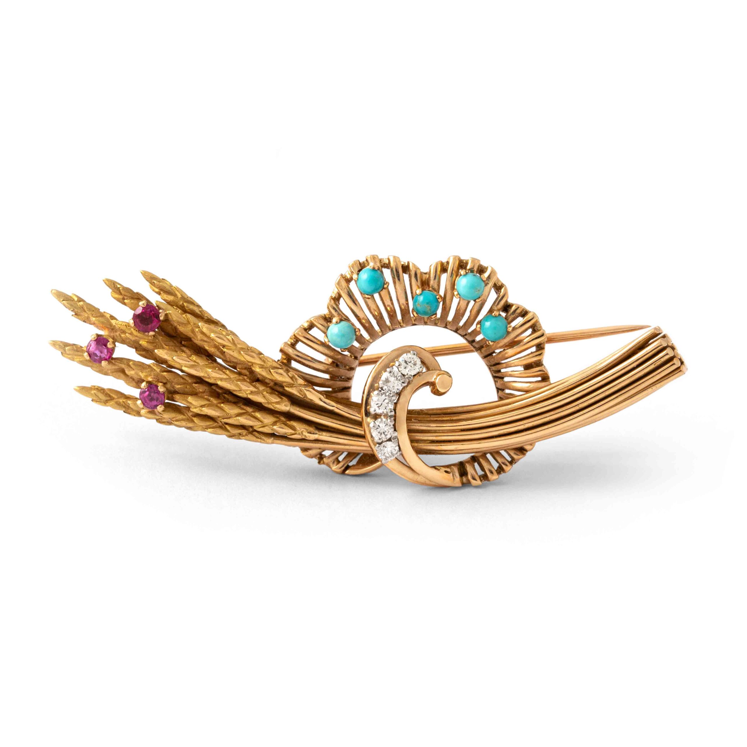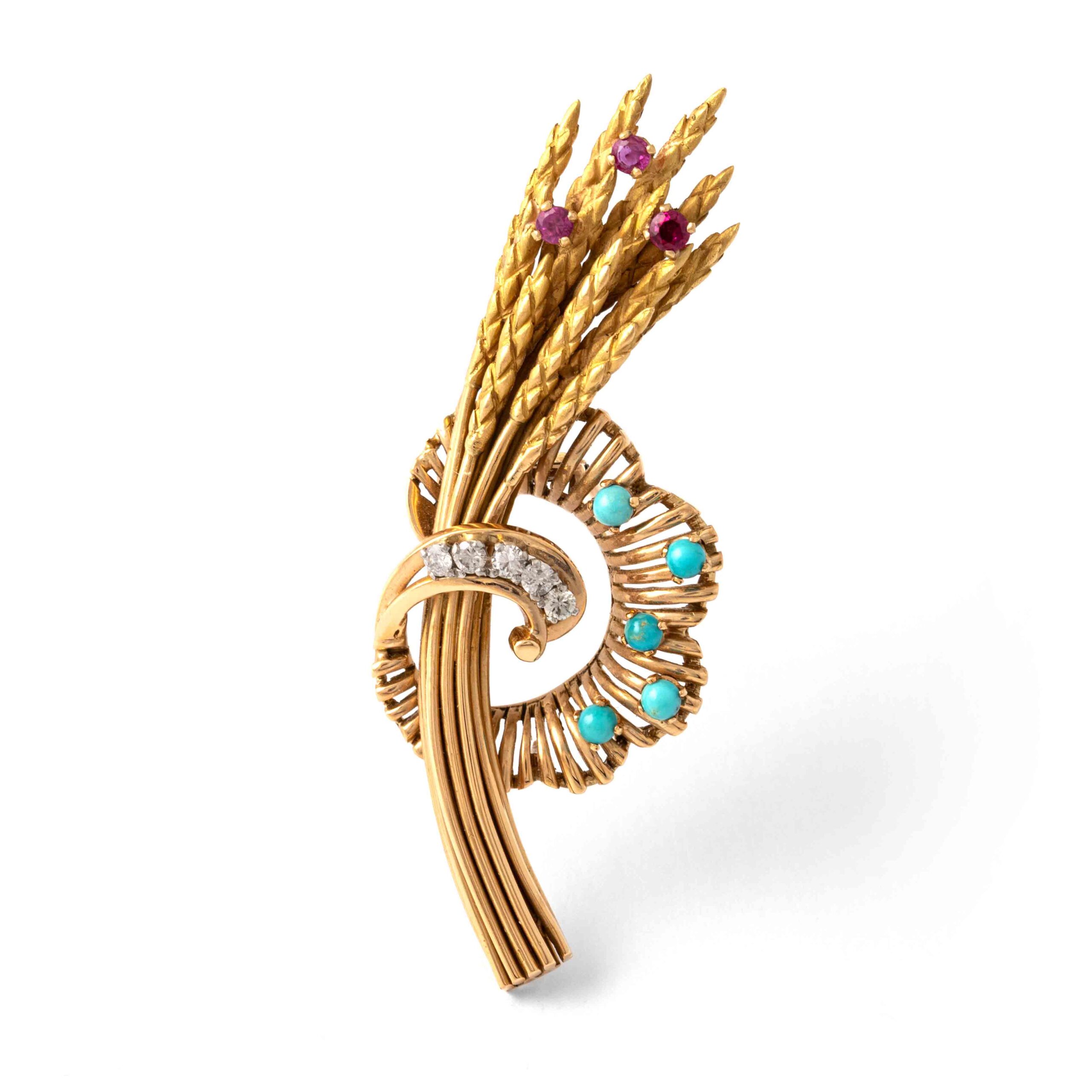 Adorn yourself with this exquisite Sheaf of Wheat brooch, beautifully stylized and crafted in 18K yellow gold. Featuring a harmonious blend of sparkling diamonds, vibrant turquoise, and rich rubies, this unique piece is a stunning embodiment of elegance and artistry.
