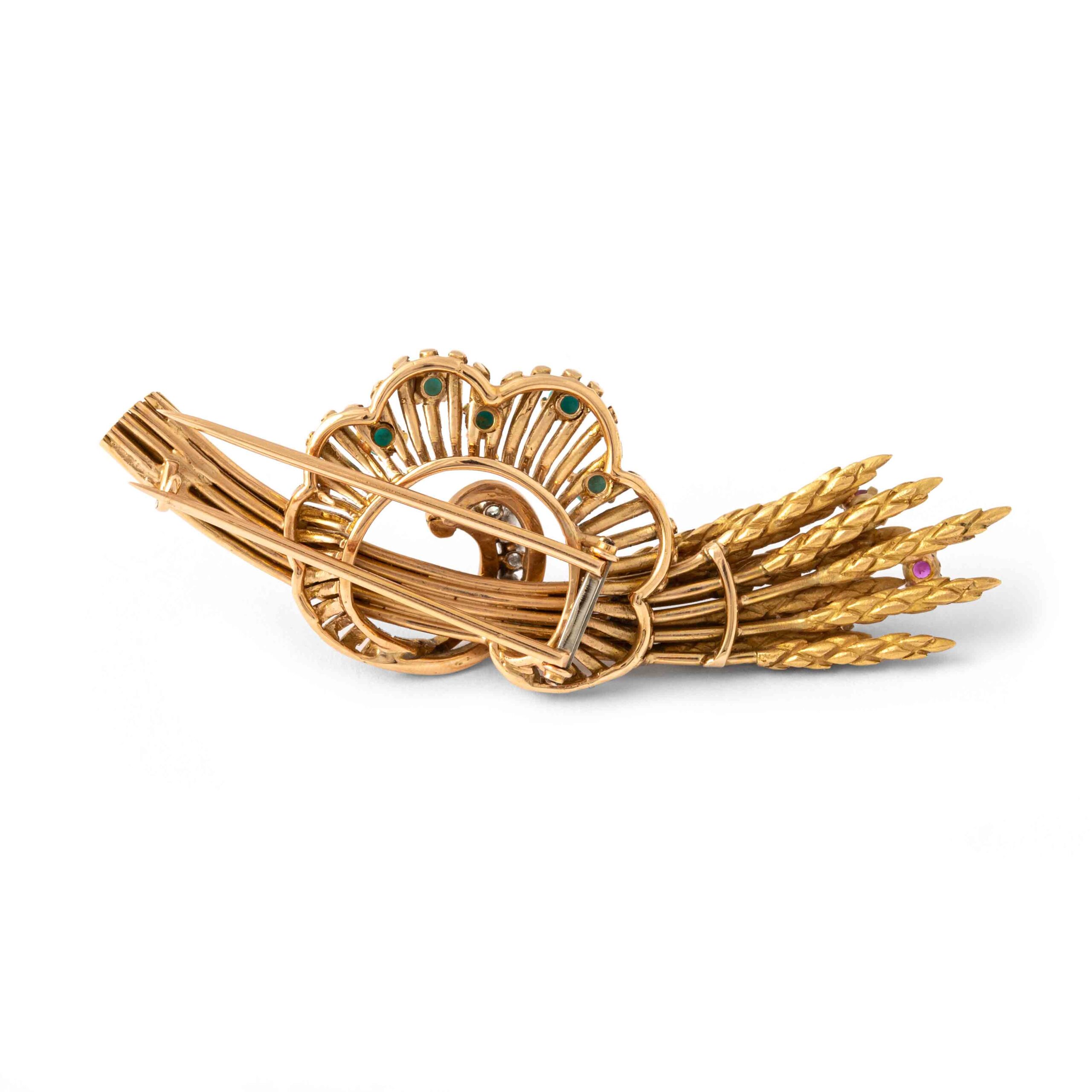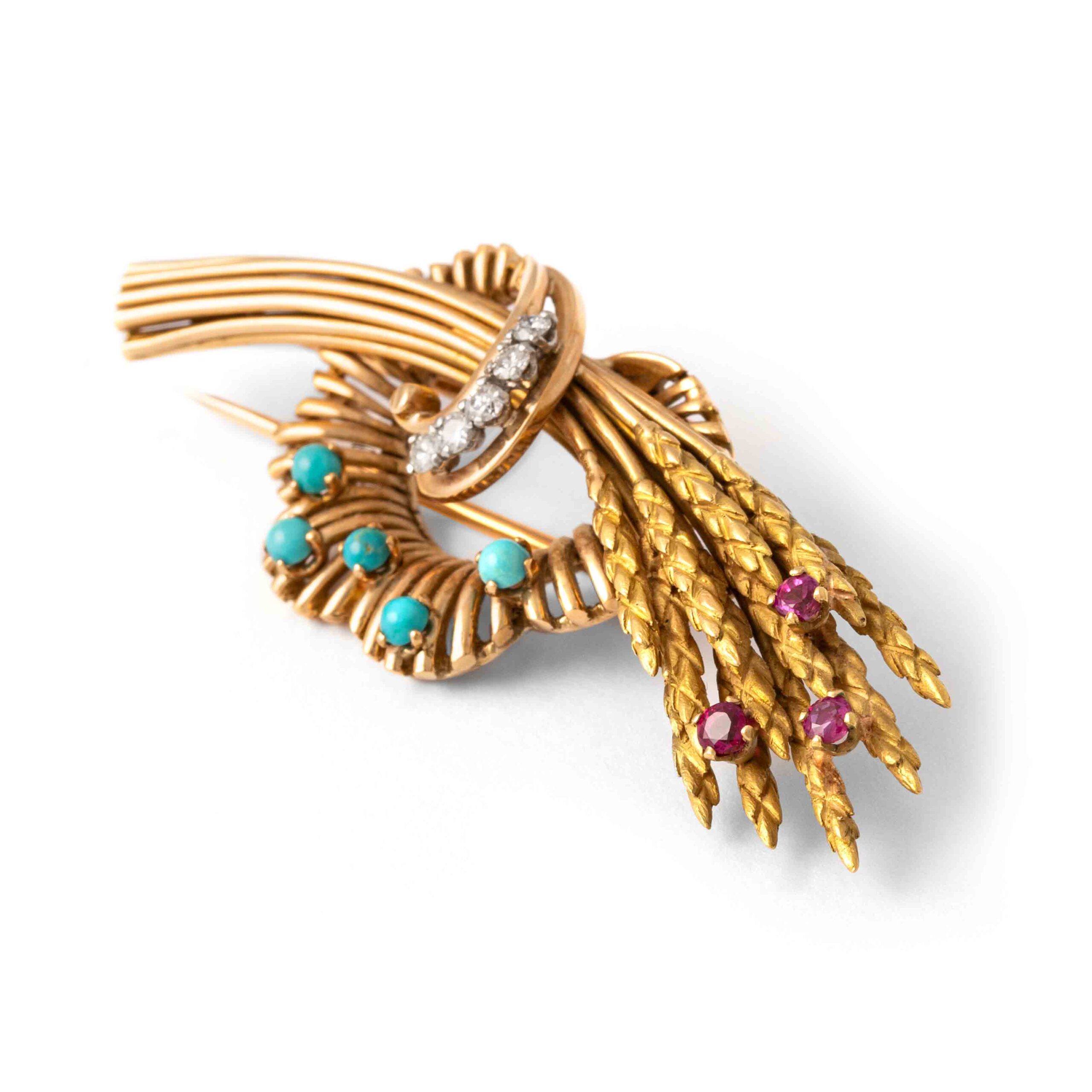 Sheaf of Wheat stylized Brooch composed by Diamond, Turquoise and Ruby on Yellow Gold 18K.