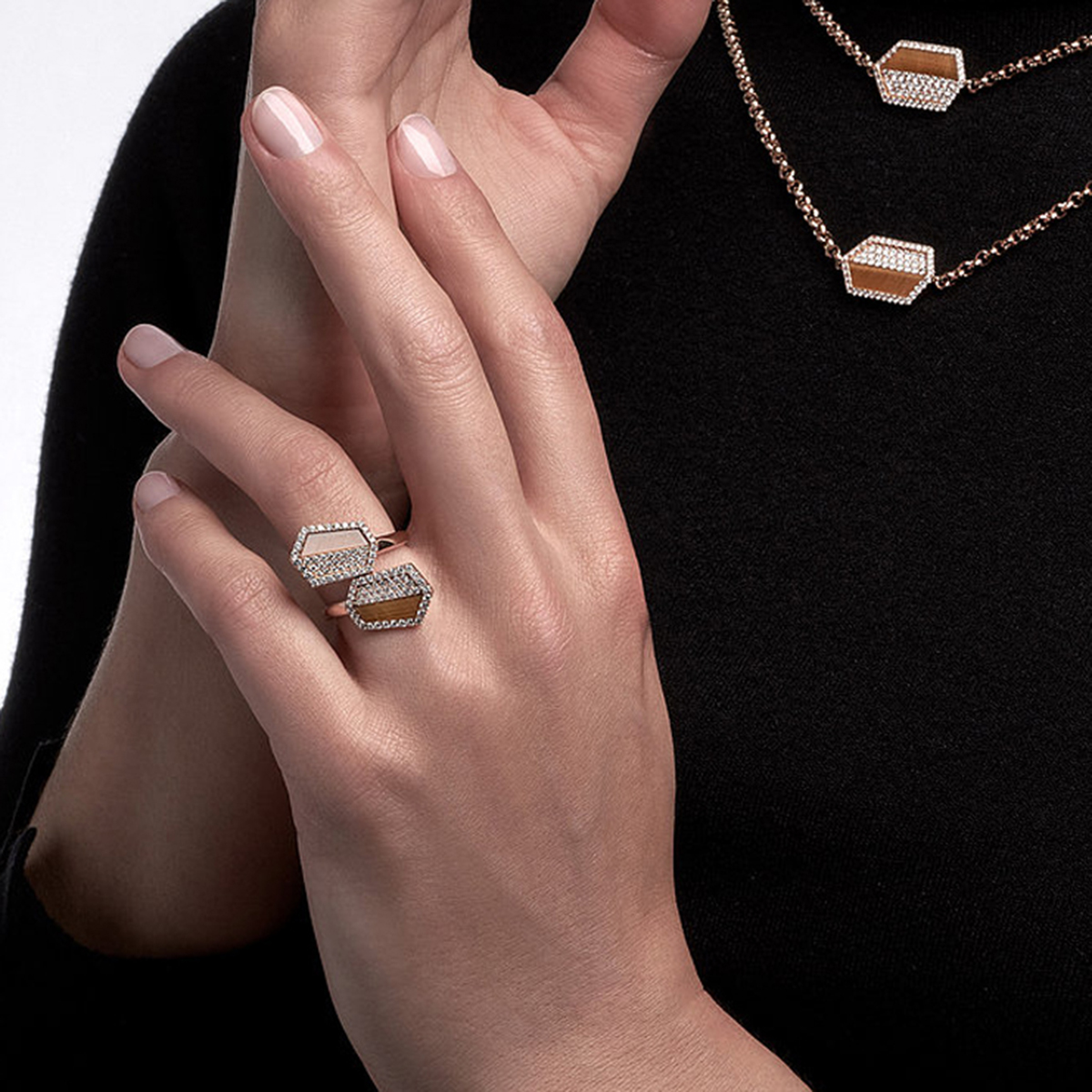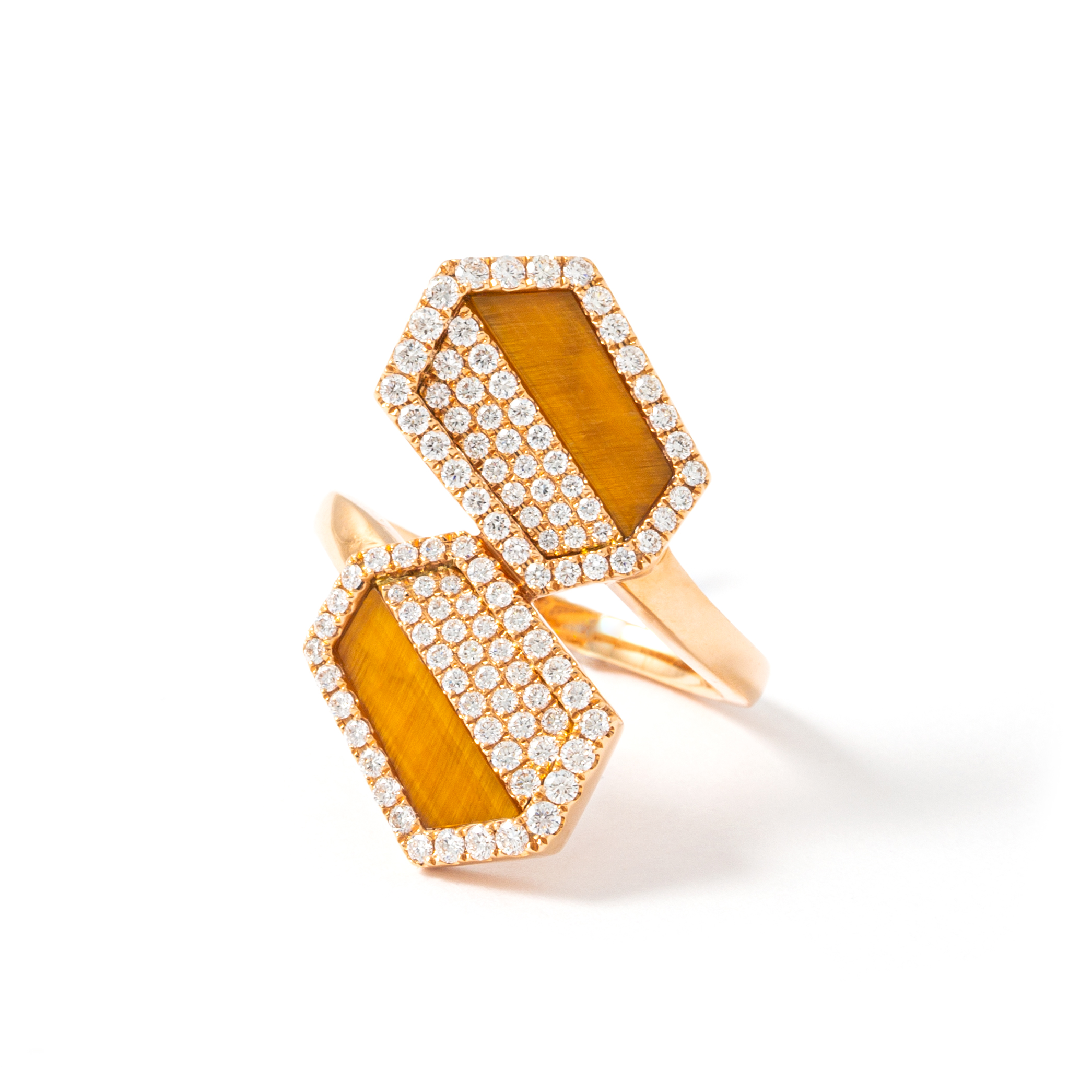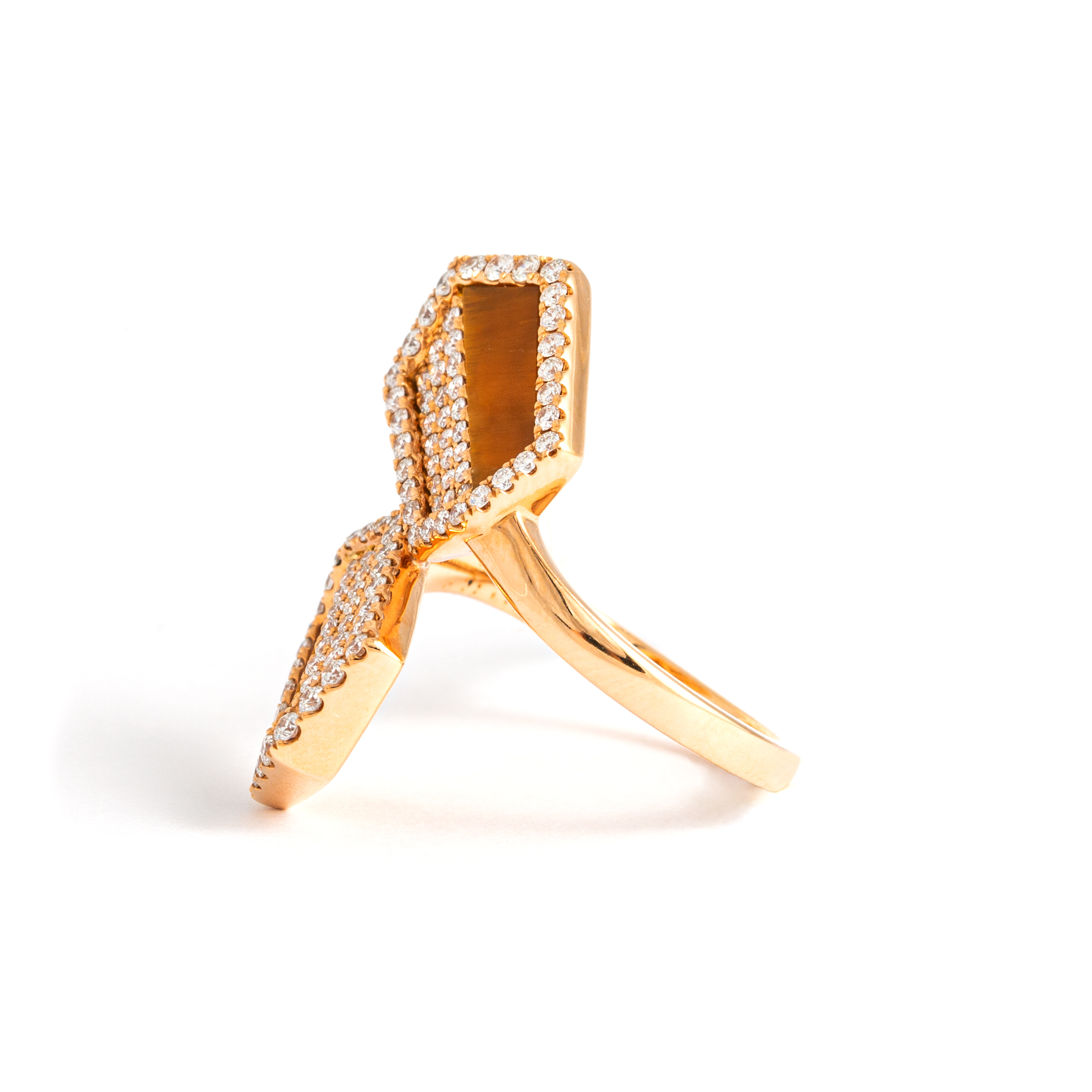 Ring in 18kt pink gold set with 104 diamonds 0.80 cts and 2 tiger eye 1.66 cts