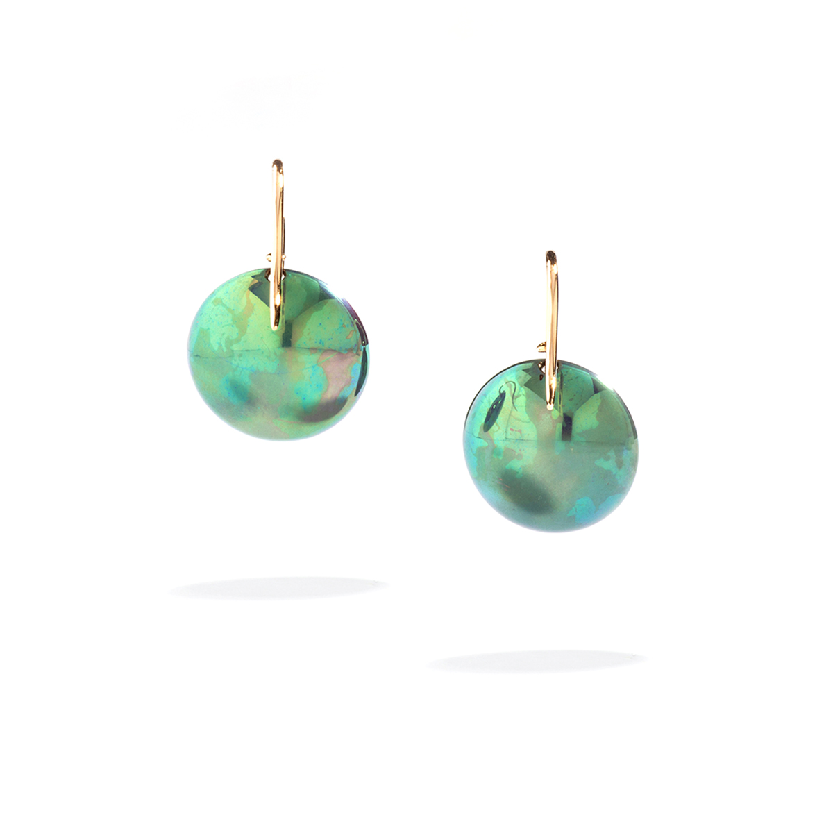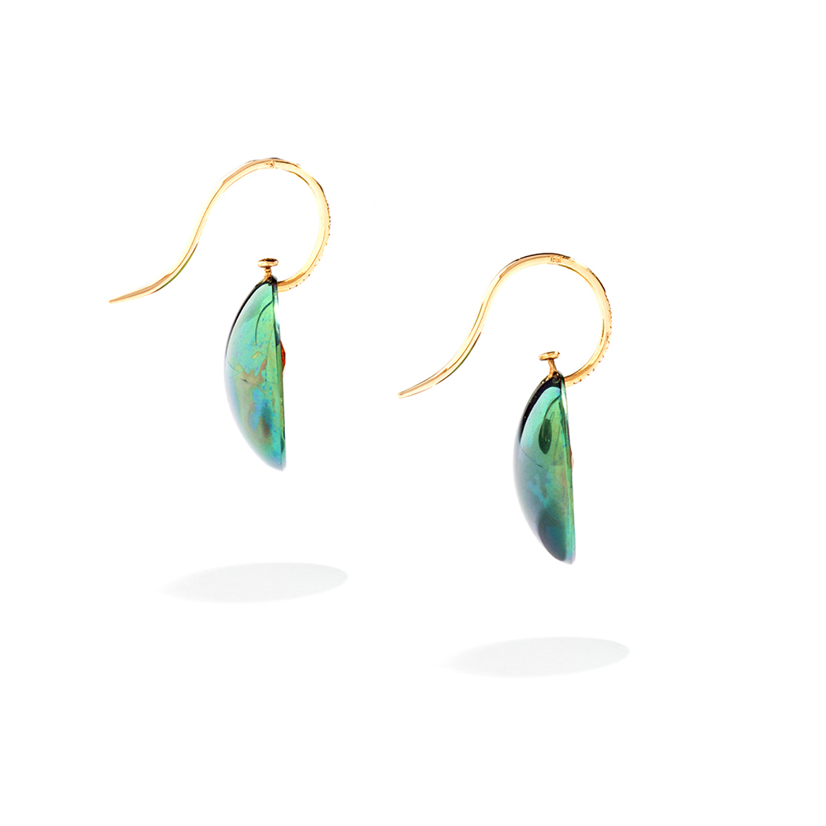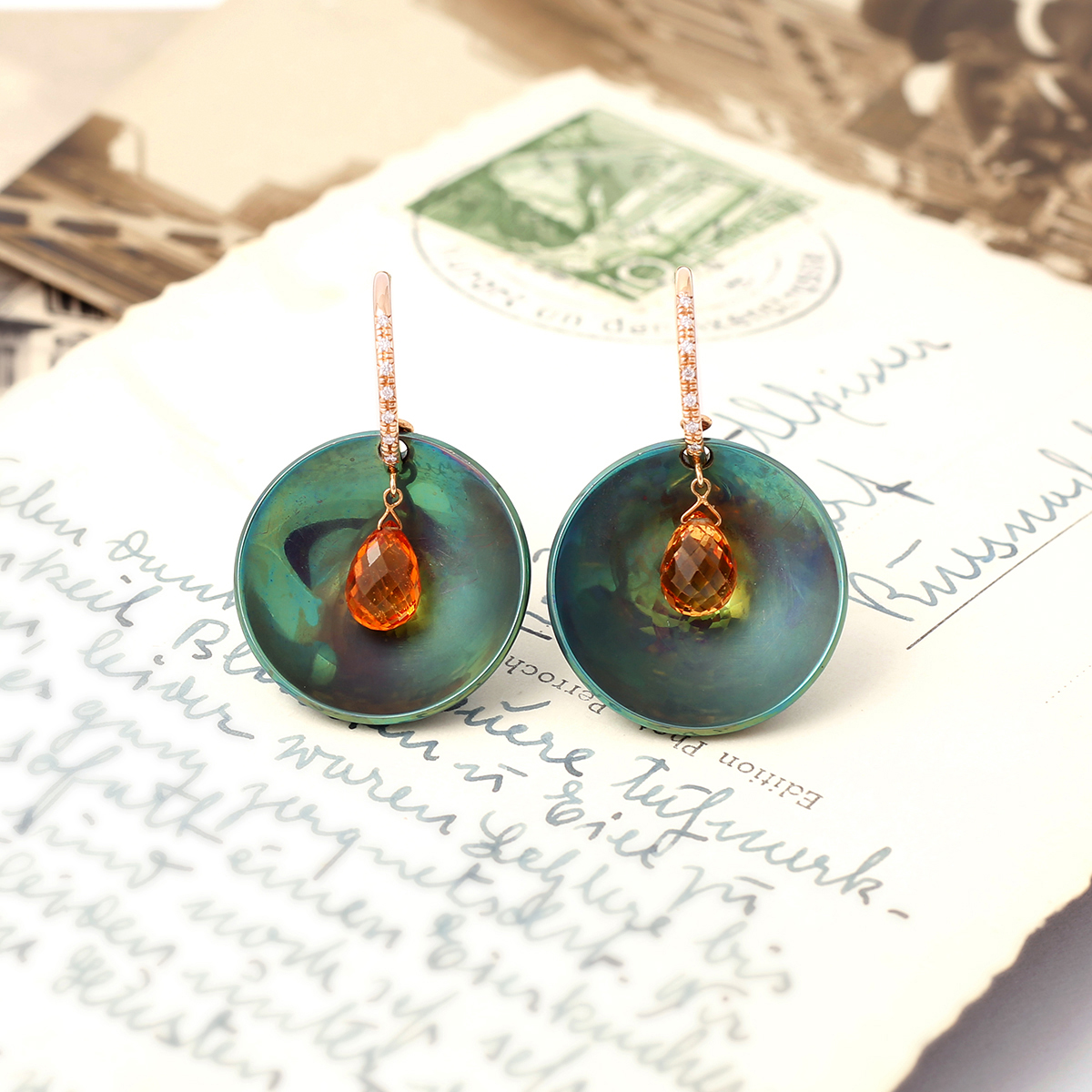Topaz Briolette and Diamond on Blue/Green rhodium Gold and yellow Gold 18k Earrings. Contemporary design.