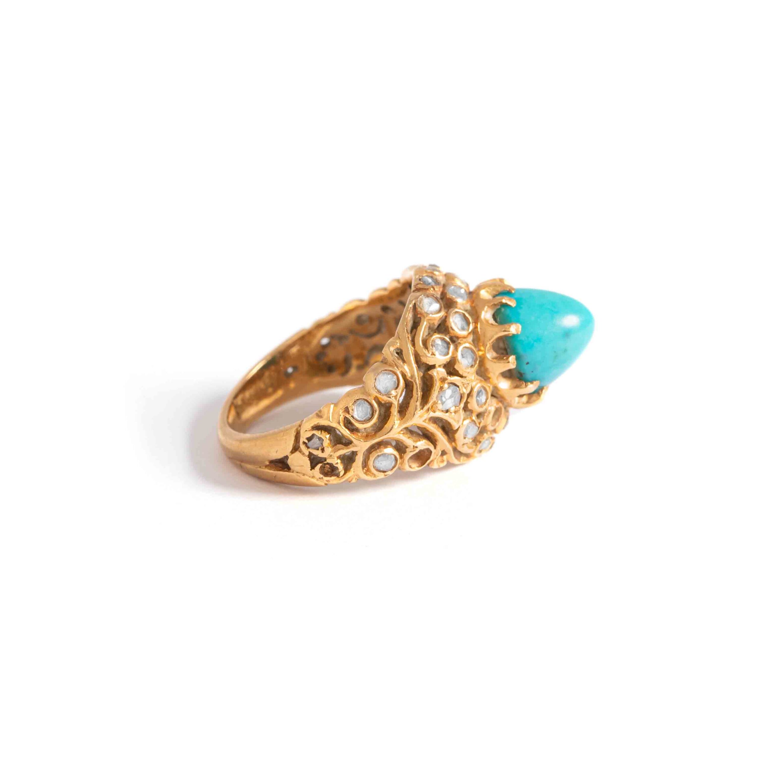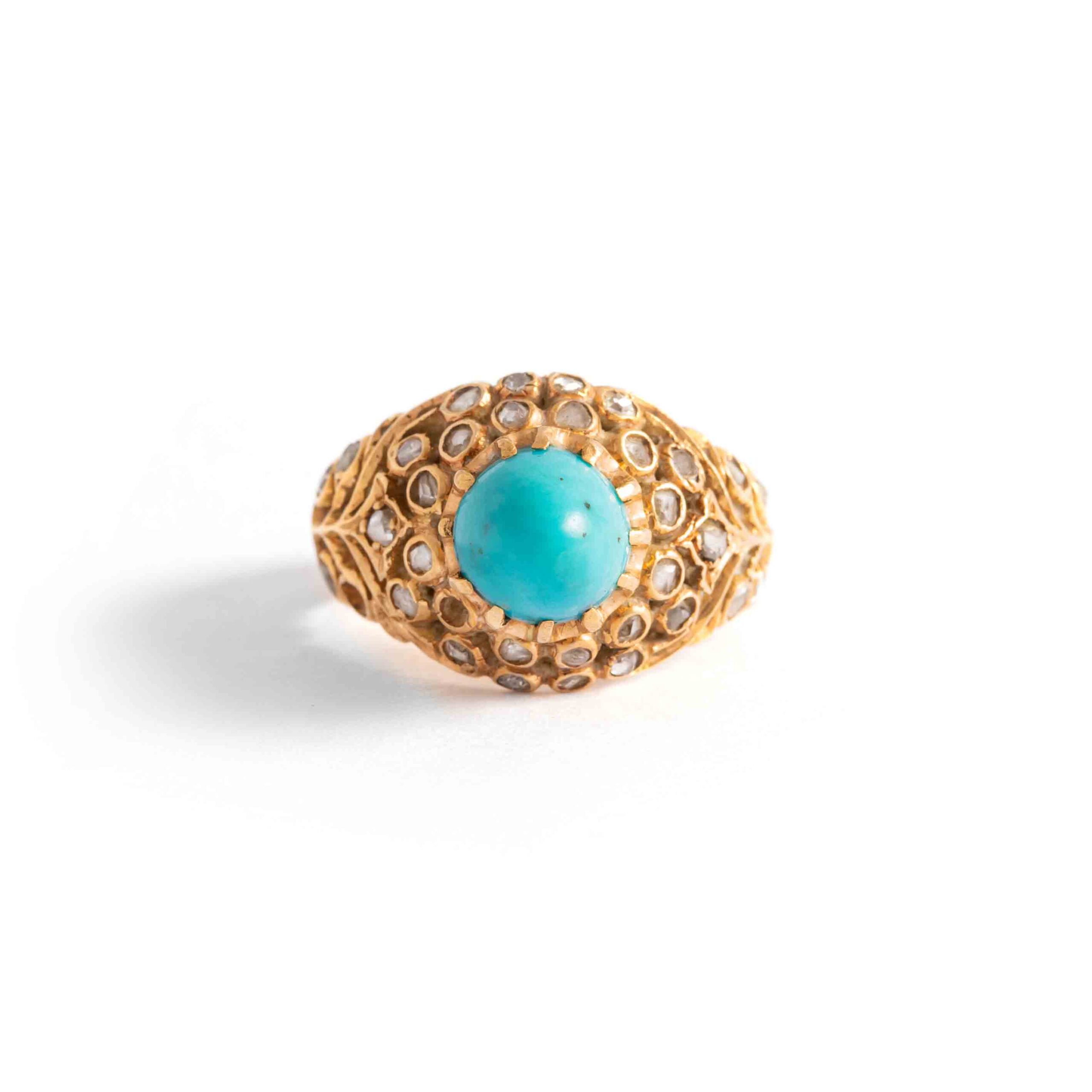18K yellow gold ring set by rose-cut diamonds and centered by a cabochon turquoise.