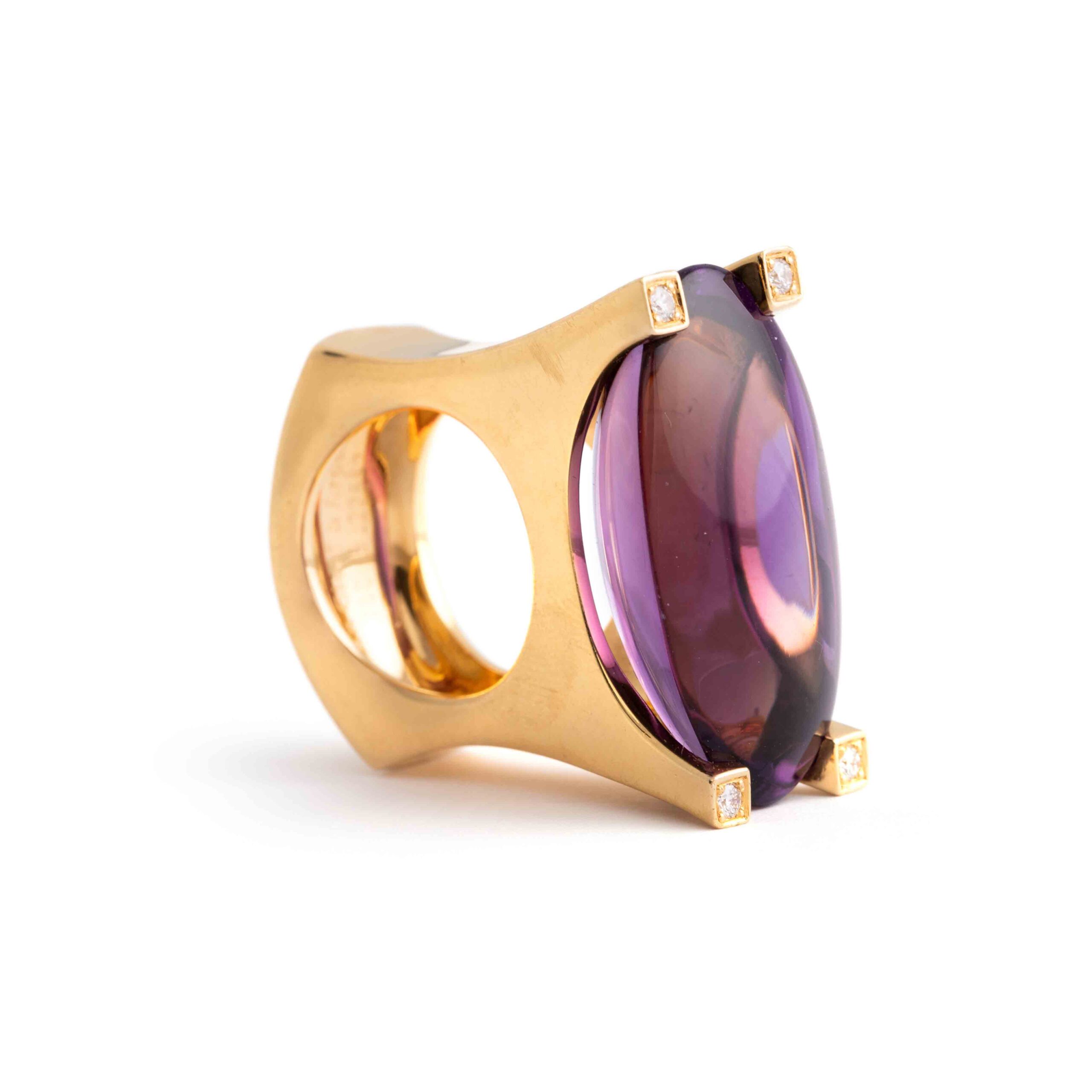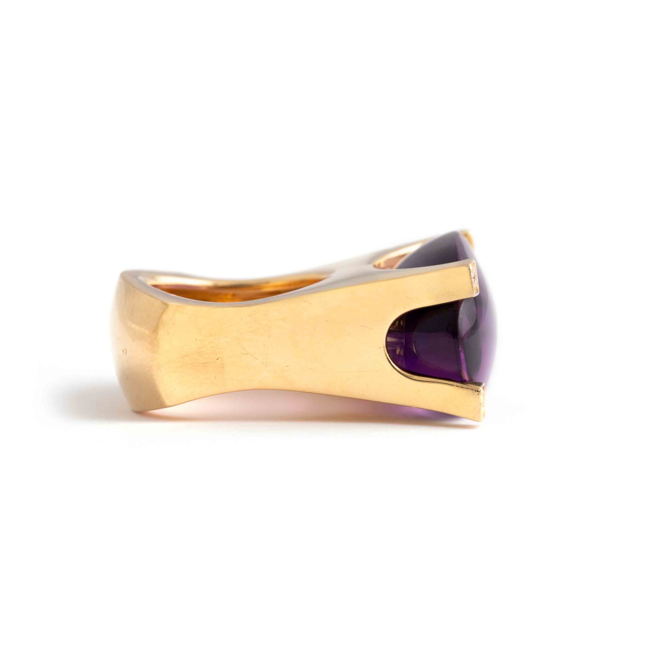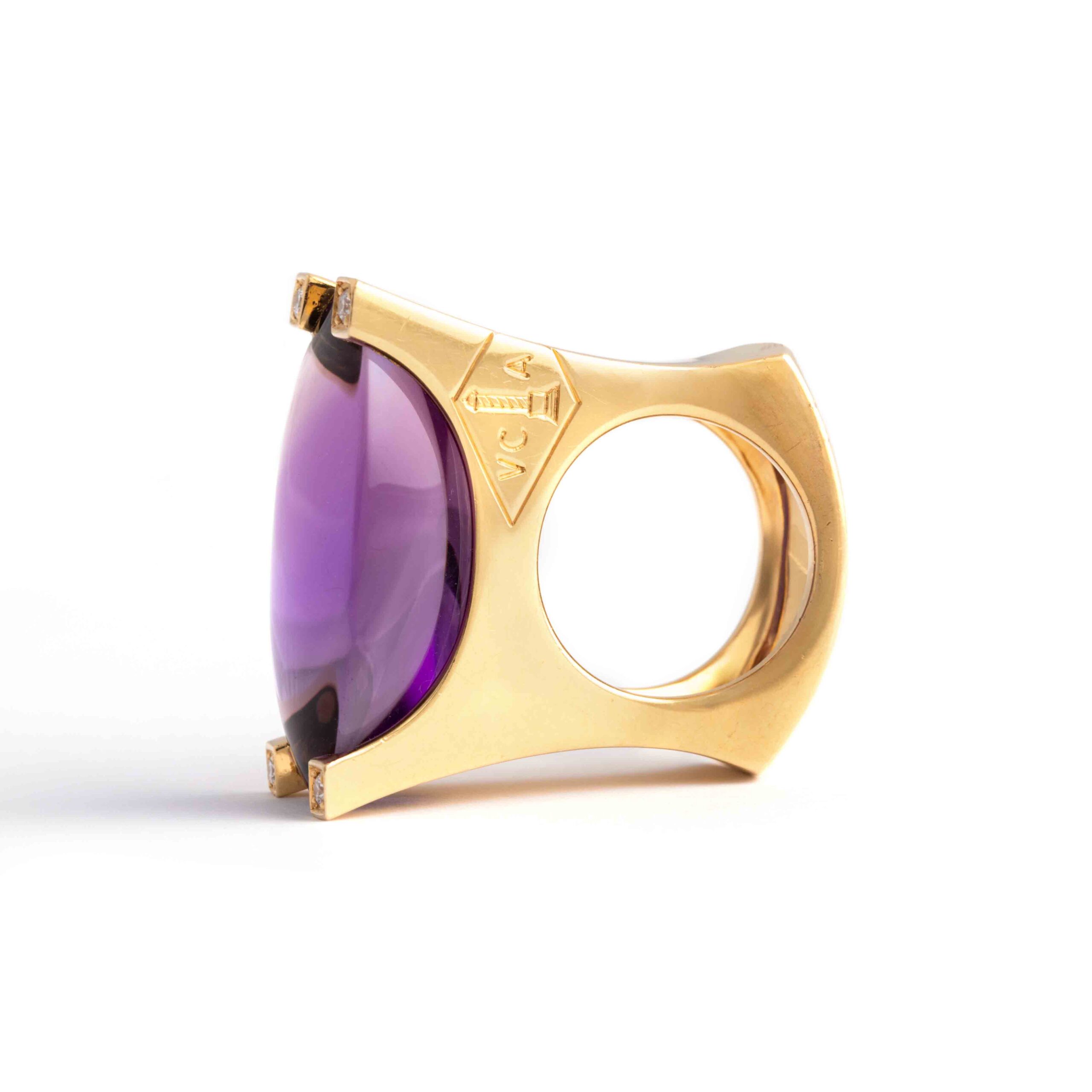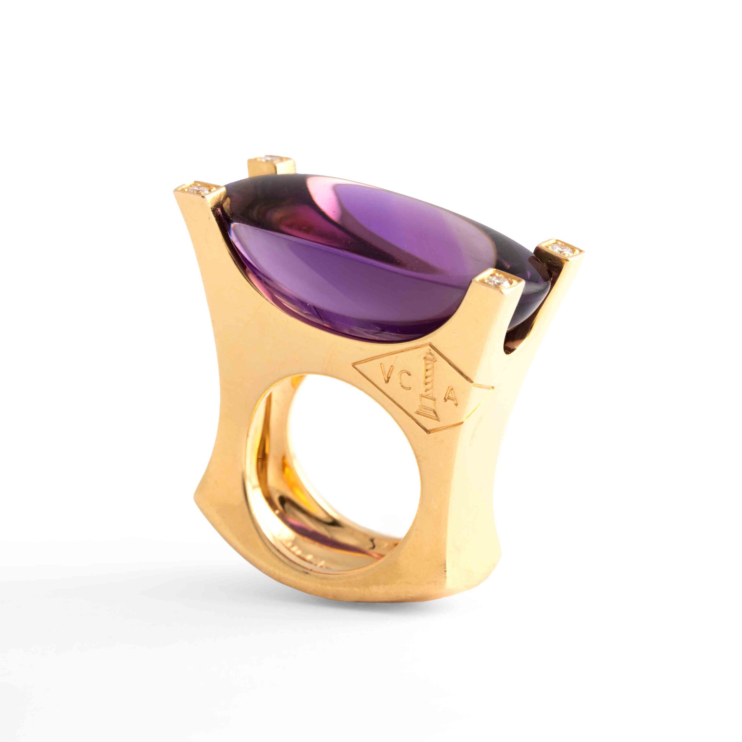 This Van Cleef & Arpels ring features a significant amethyst set in 18K yellow gold, accented with sparkling diamonds. Signed “VCA” for Van Cleef & Arpels, it exemplifies the brand’s renowned elegance and craftsmanship.