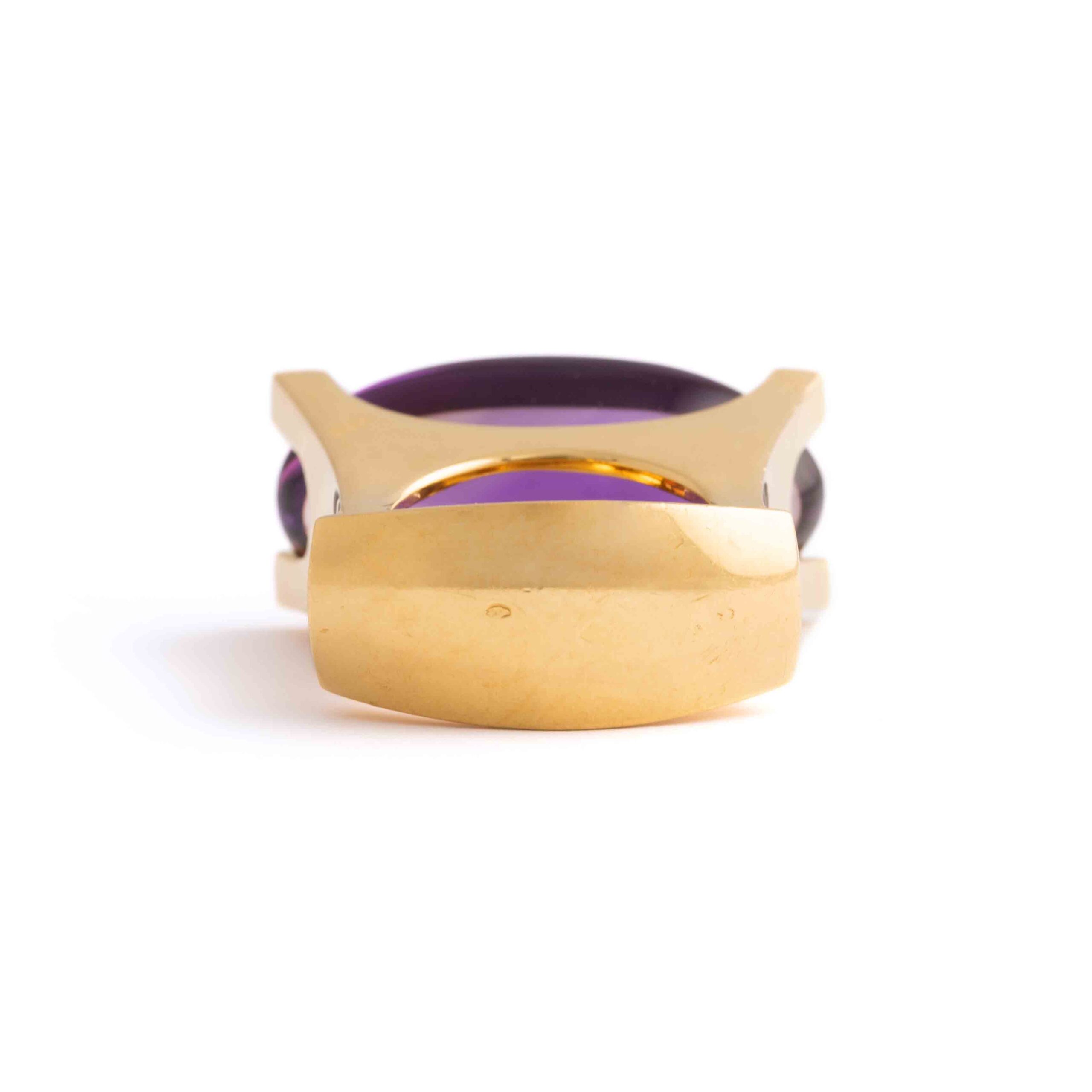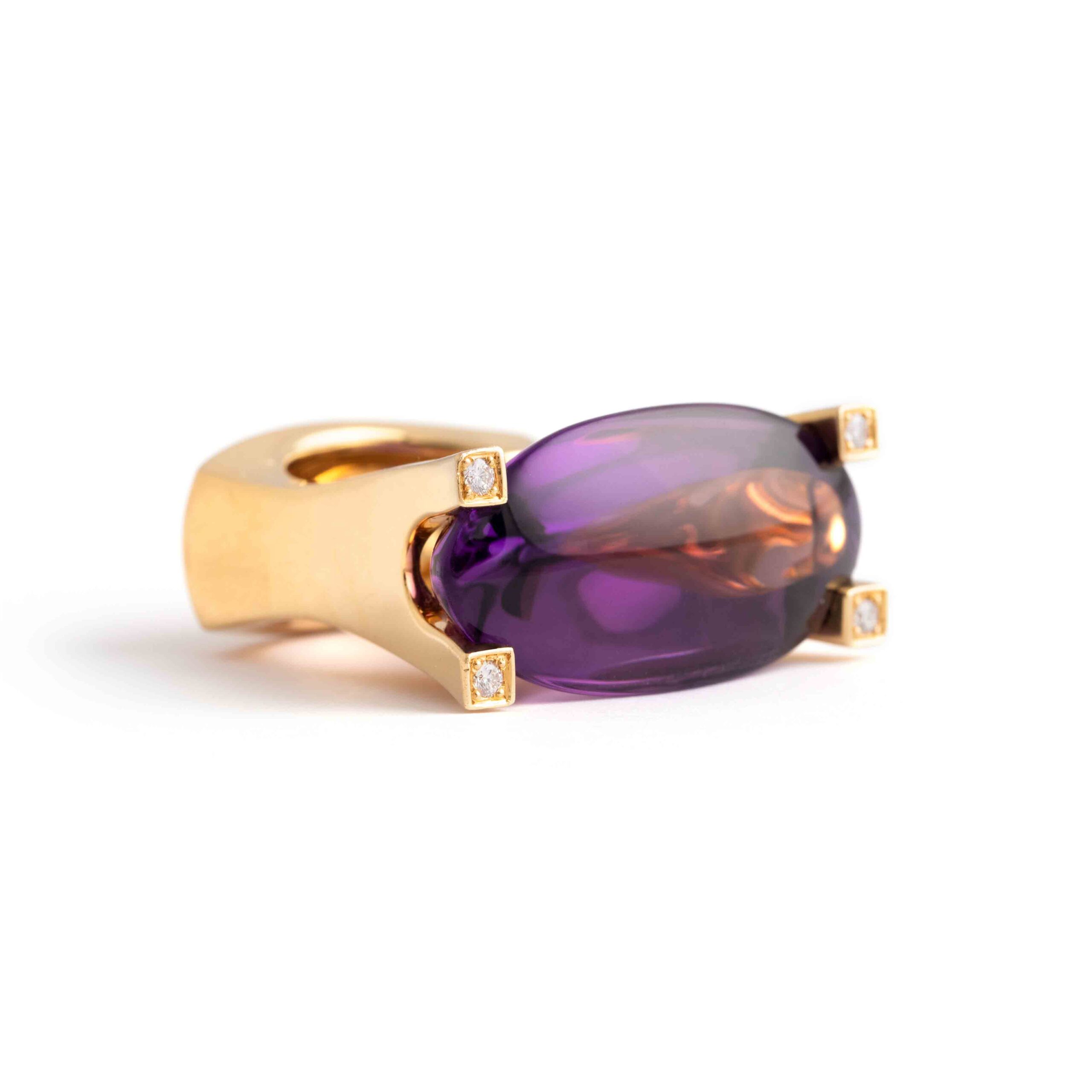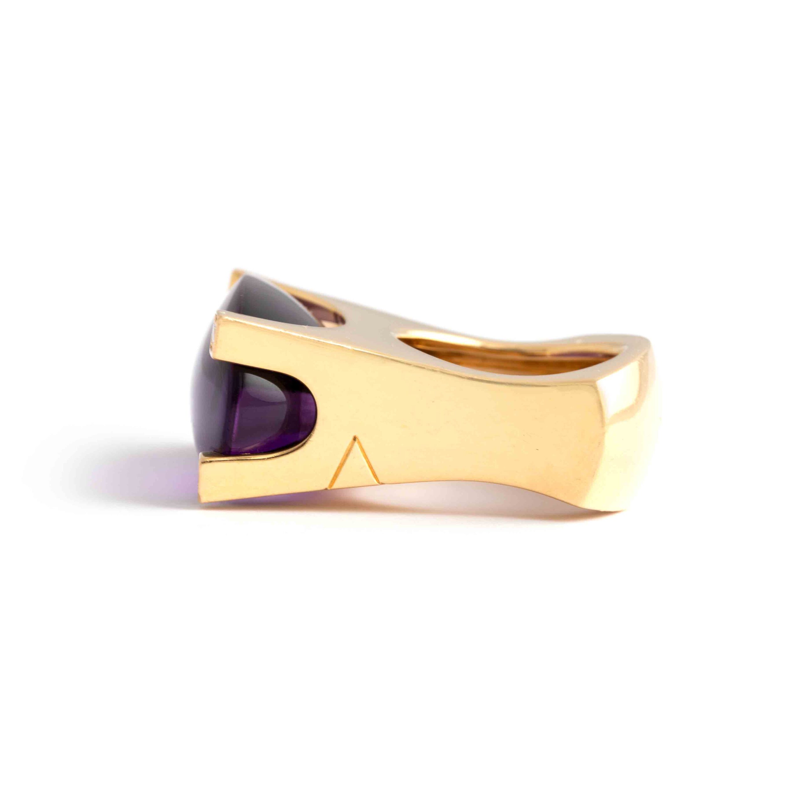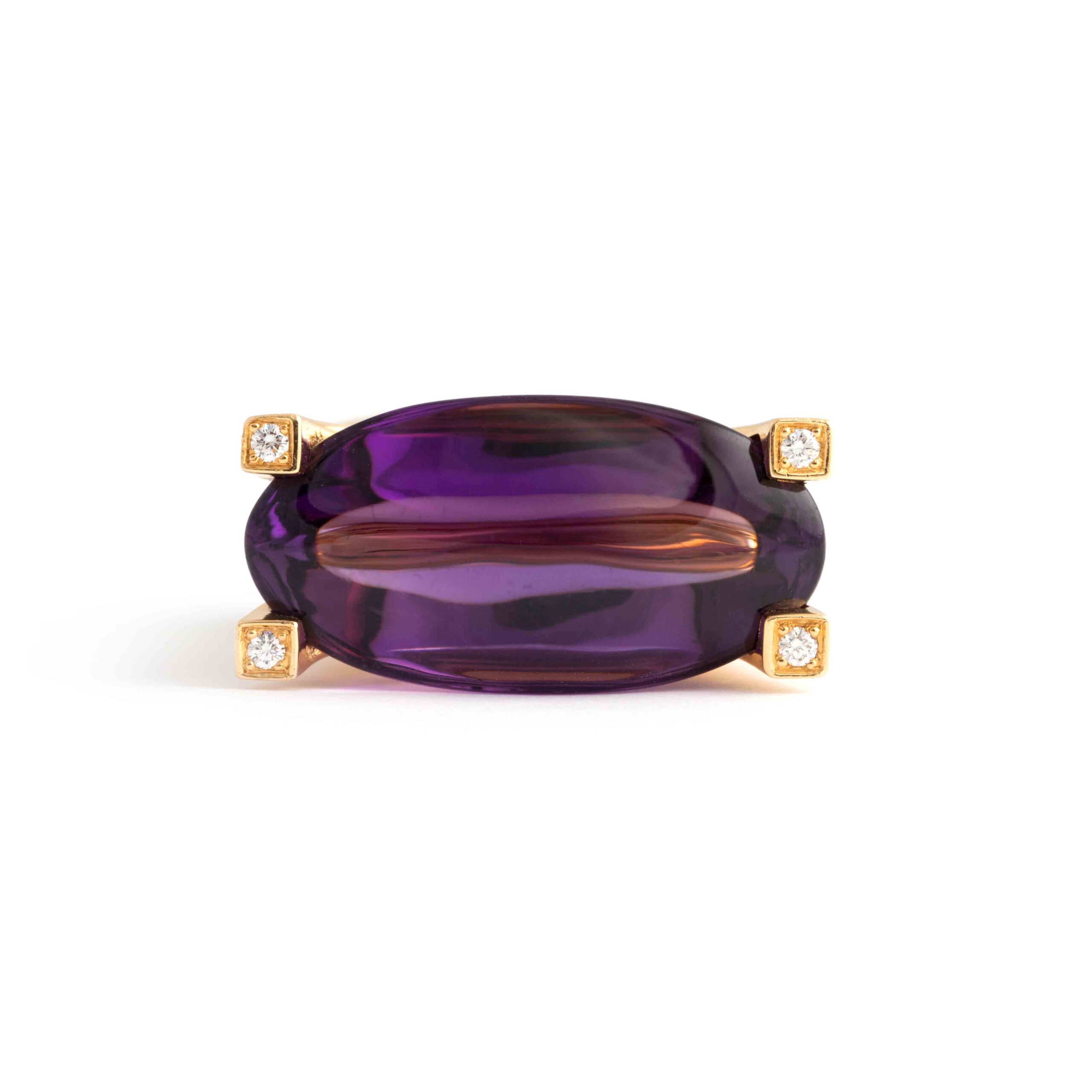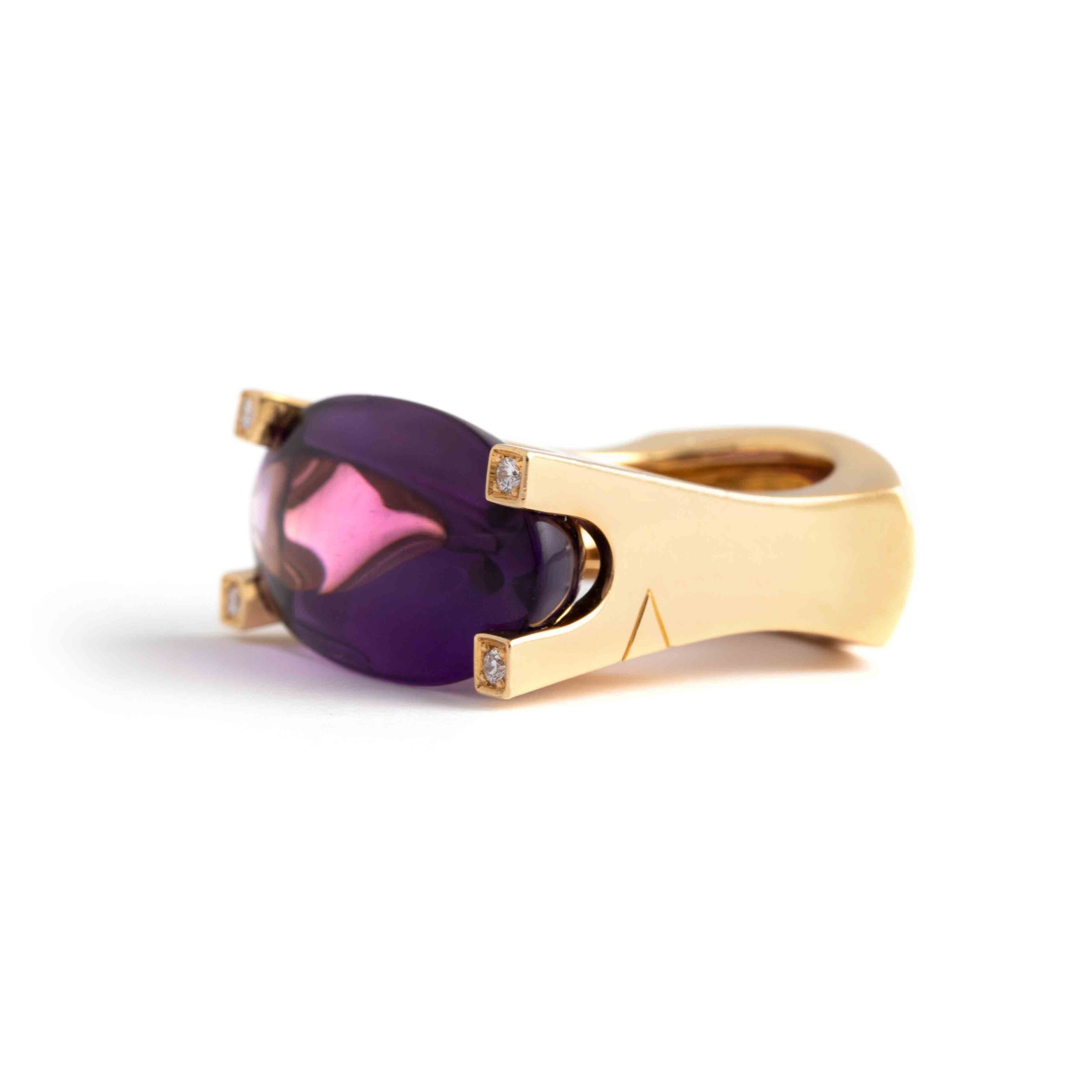 This Van Cleef & Arpels ring features a significant amethyst set in 18K yellow gold, accented with sparkling diamonds. Signed “VCA” for Van Cleef & Arpels, it exemplifies the brand’s renowned elegance and craftsmanship.