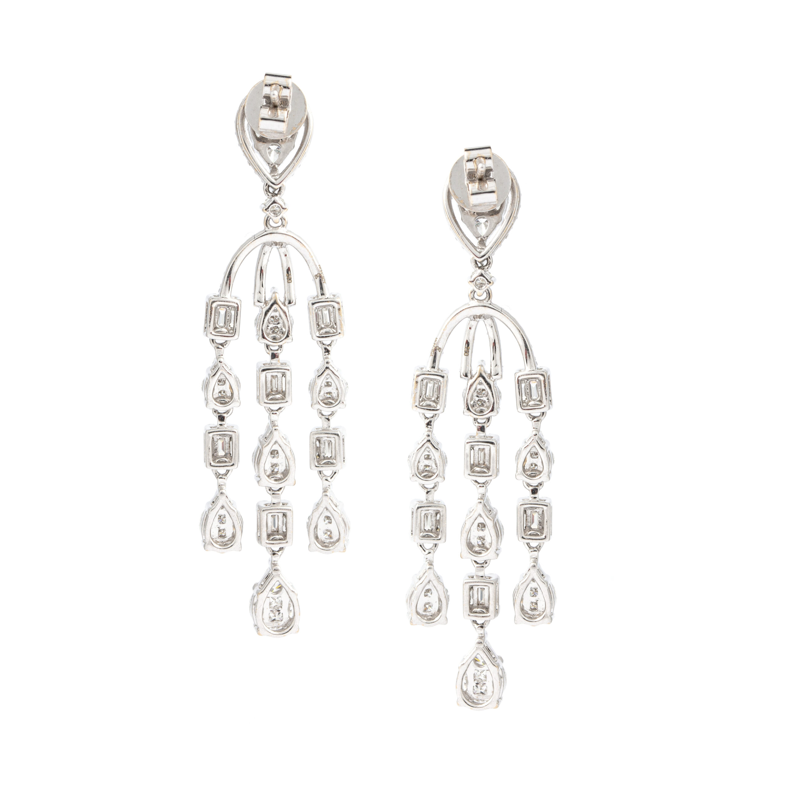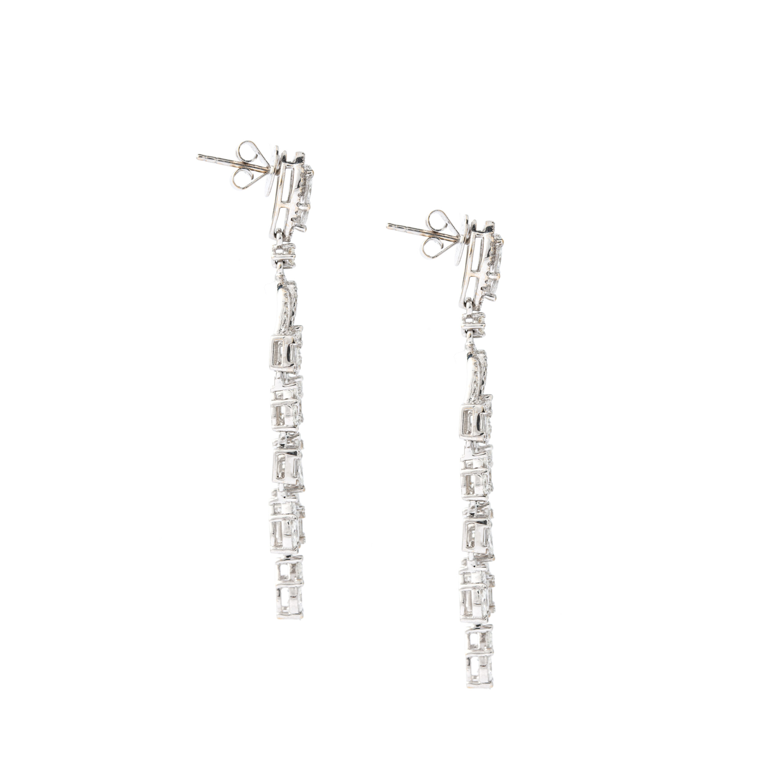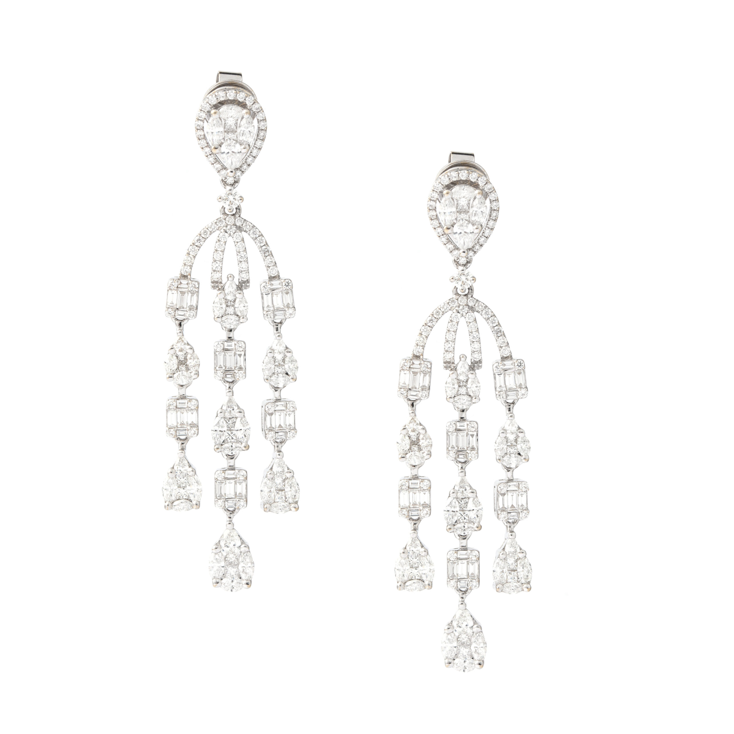 Earrings in 18kt white gold set with 156 pears shape, baguette, princess marquise cut diamonds 4.97 cts and 150 diamonds 1.08 cts.